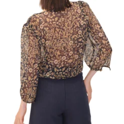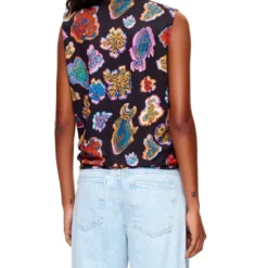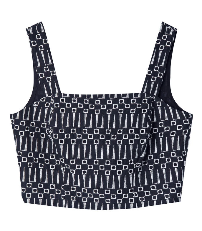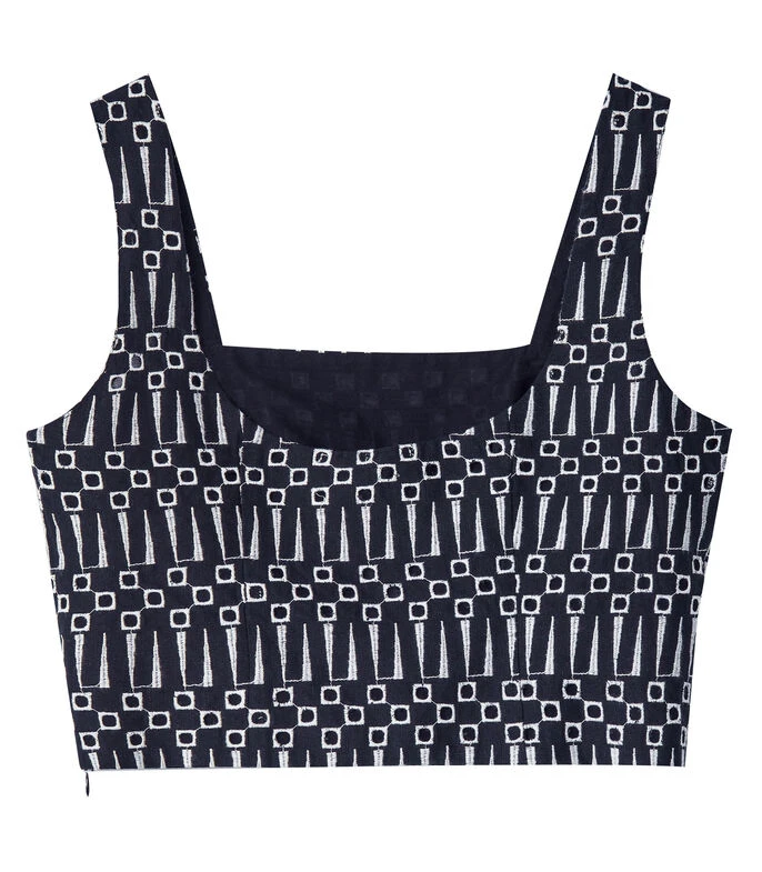 Blusa Adolfo Dominguez tipo crop top en tejido de punto con diseño de figuras en mosaico, sin mangas y cuello redondo.