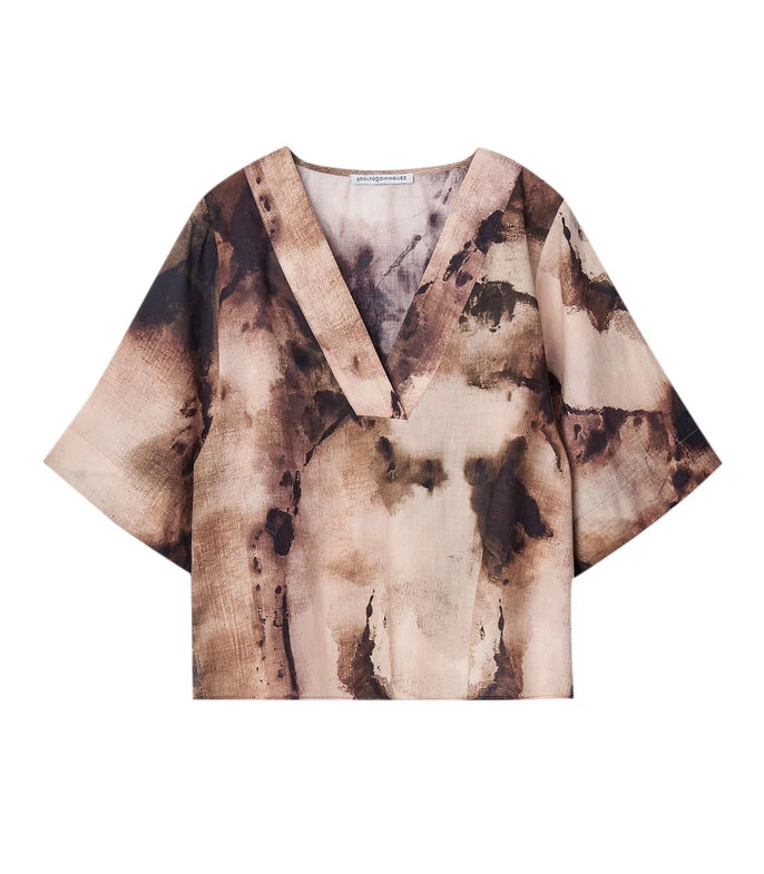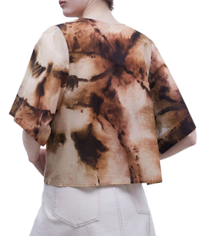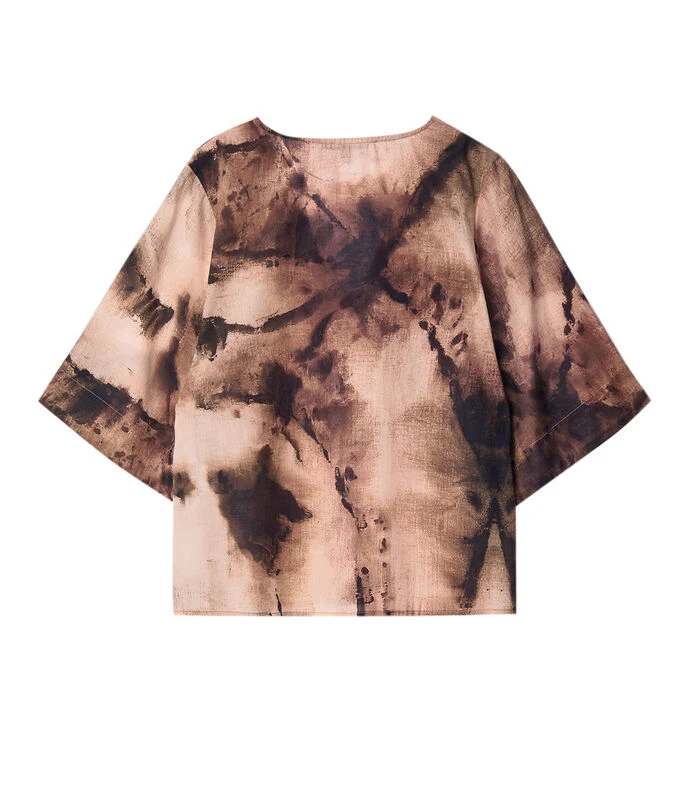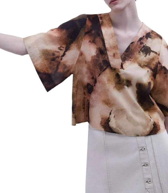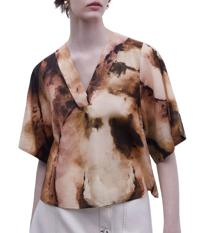 Blusa Adolfo Dominguez de corte Oversized en tejido de punto multicolor, cuello en «V» y manga 3/4. Fresca y con estilo todo el día.