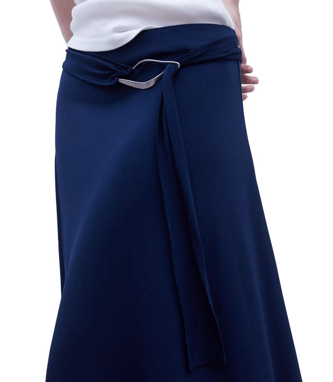 Falda Maxi Adolfo Dominguez; elaborada en tejido plano con detalle de cinturón fijo en cintura con sutil hebilla metálica y cierre de lágrima detrás.