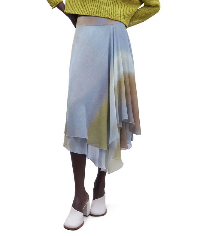 Falda midi Adolfo Dominguez de corte regular en tejido plano semitransparente de dos capas, print tipo tie-dye y cierre de lágrima en lateral.