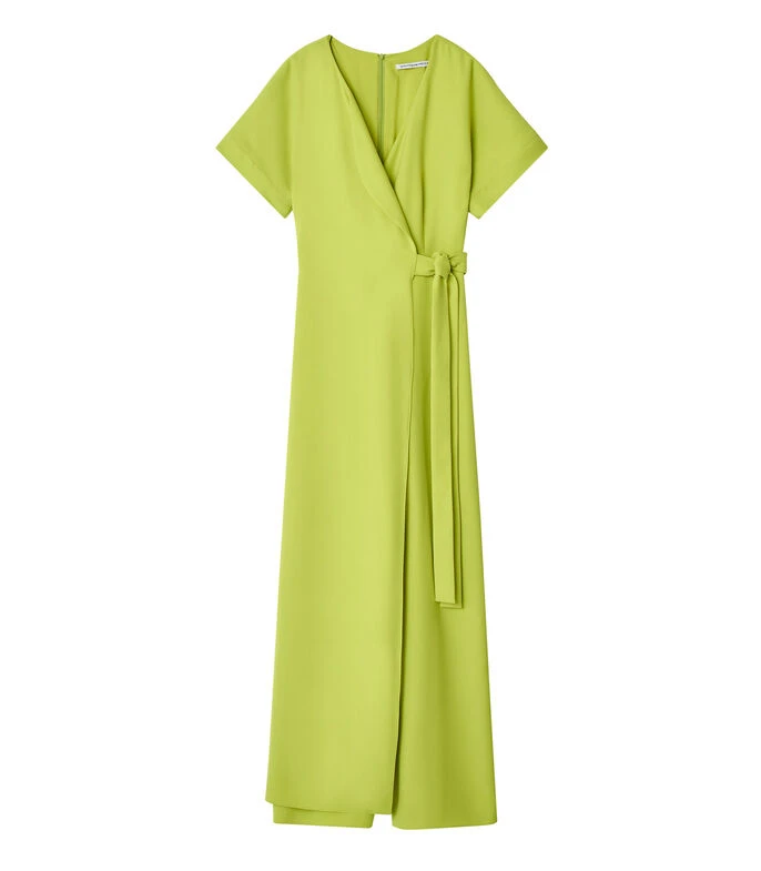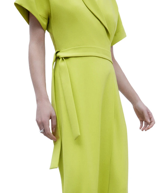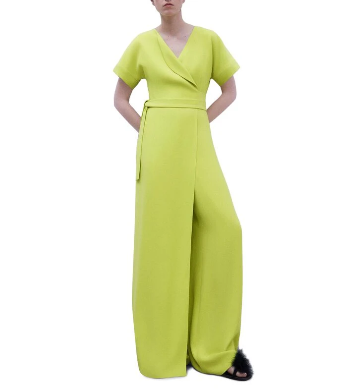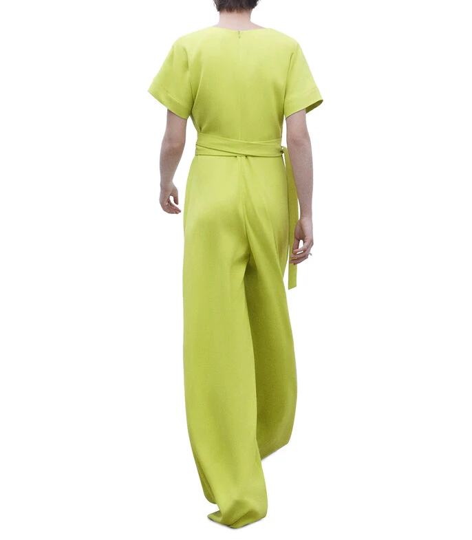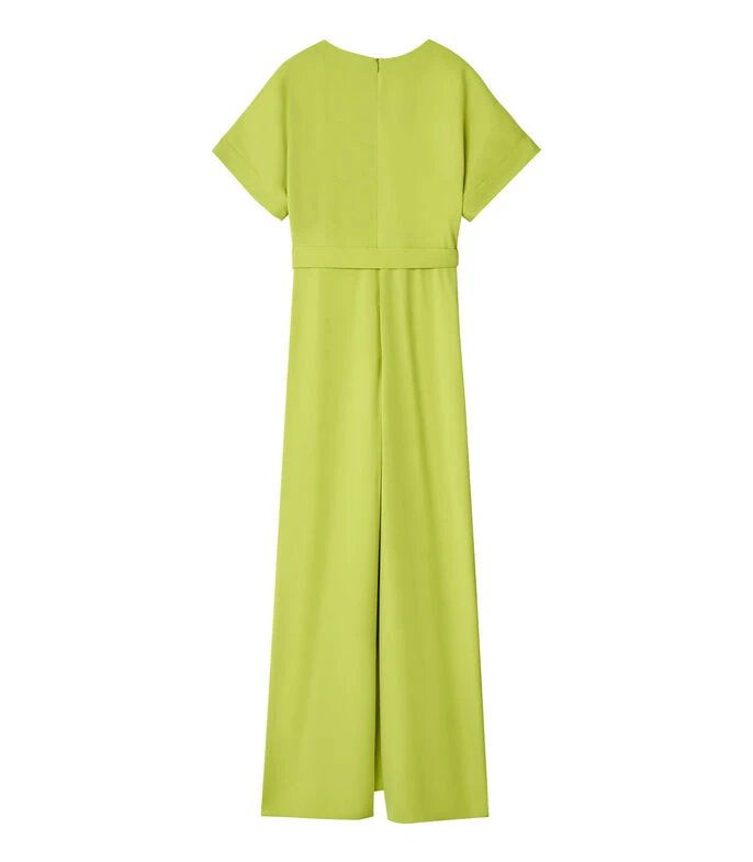 Mono Adolfo Dominguez de corte recto en tejido de punto, cuello «V» con solapa, manga corta, detalle de cinta ajustable en cintura y cremallera en espalda.