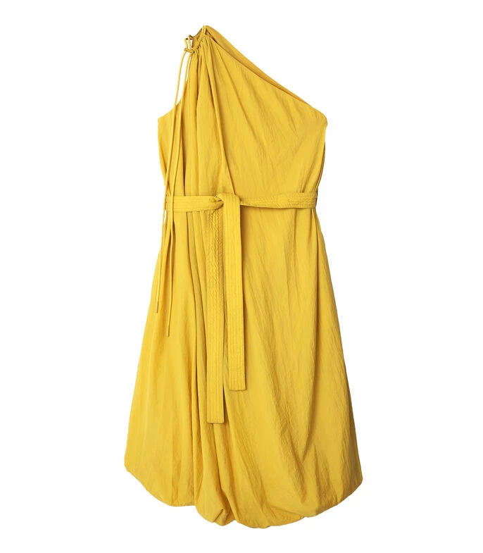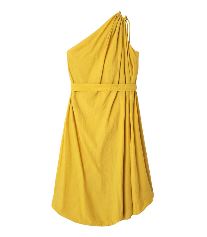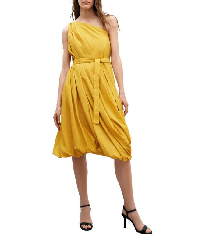Vestido Adolfo Dominguez Midi de corte recto; en tejido de punto liso con cuello asimétrico, hombro acompañado de cordón, cinta de amarre en cintura y efecto fruncido en la parte baja. No pierdas la oportunidad de lucir radiante y dejar huella con este magnífico vestido ¡Hazte con el tuyo y deslumbra con tu estilo inconfundible!