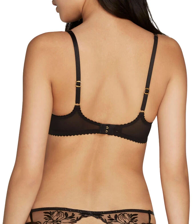 Brasier sin copa Agent Provocateur en tejido de punto, varilla en parte inferior, tirantes delgados y cierre de gancho en parte posterior; El estilo abierto sin copa de Ozella invita a las valientes y atrevidas a portar estilo escandaloso.