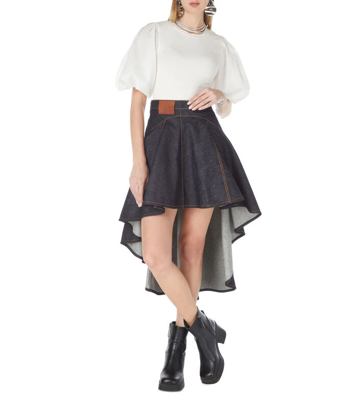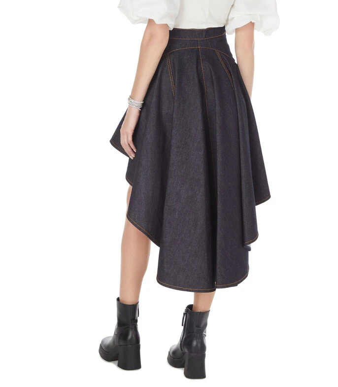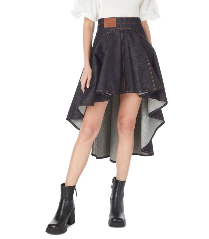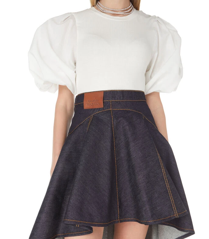 Falda mini Alexander McQueen de corte A en mezclilla, cierre de cremallera, parte posterior asimétrica y pespuntes a contraste.