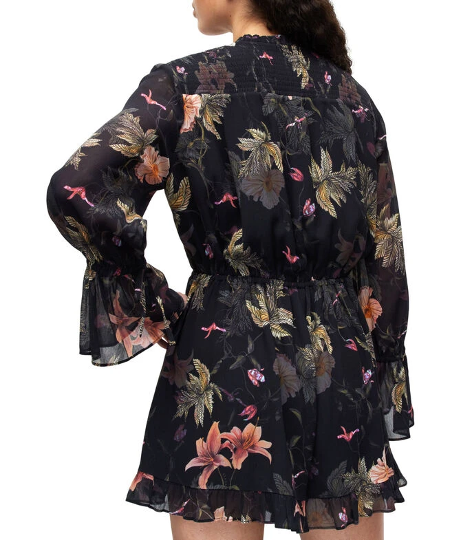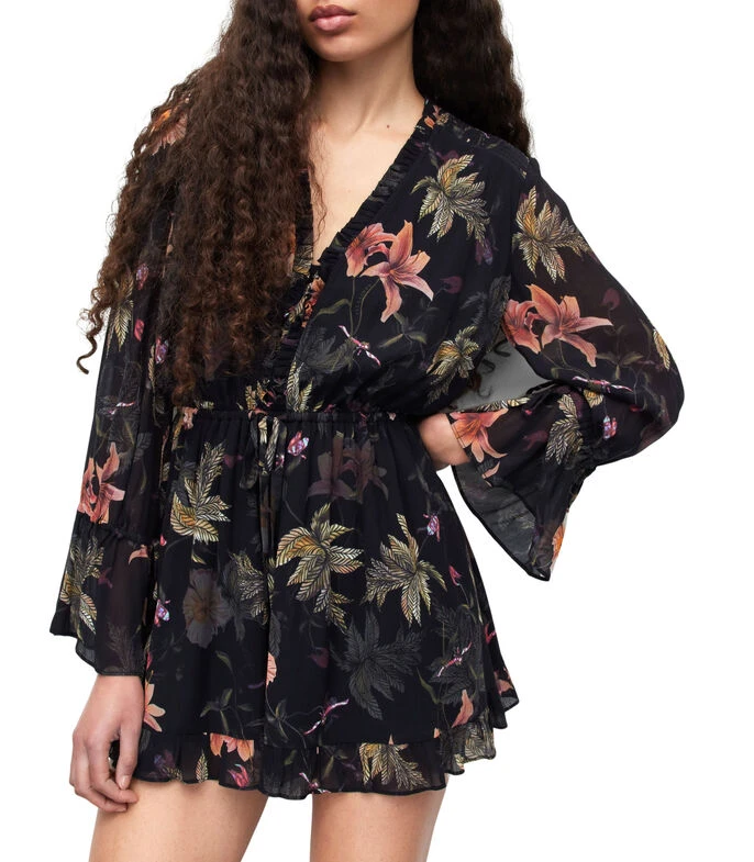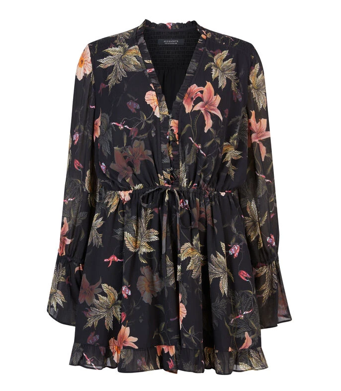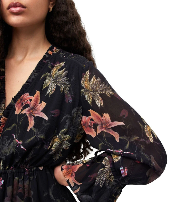 Jumper AllSaints Daria de corte recto en tejido de punto con estampado de flores, manga abullonada, cuello V, aplicación de volantes, detalles semitransparentes, cintura ceñida y botones a tono.
