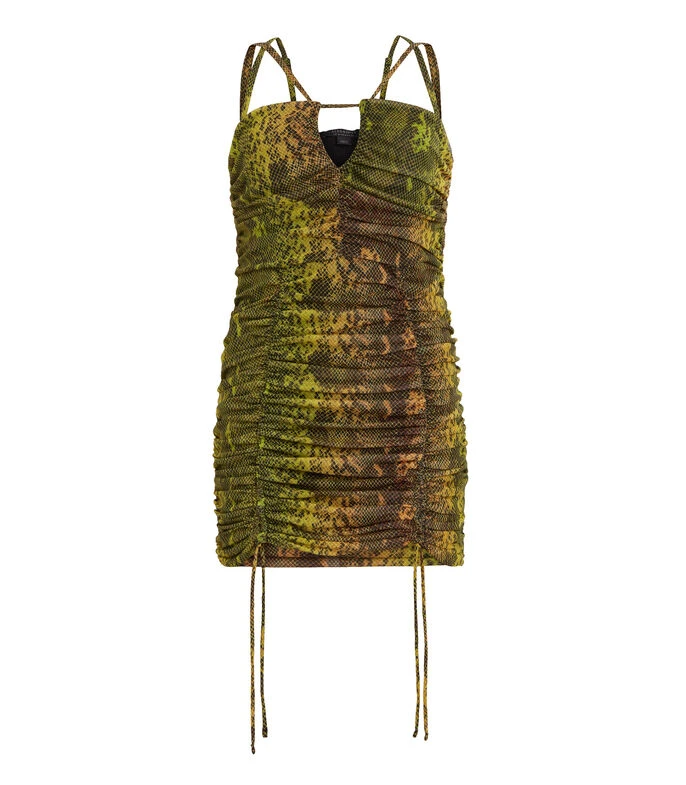 Vestido mini AllSaints Gloria de corte ajustado en tejido de punto con diseño de pliegues, tirantes finos entrelazados, estampado animalprint y abertura en escote.
