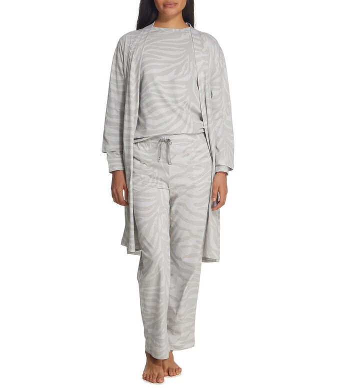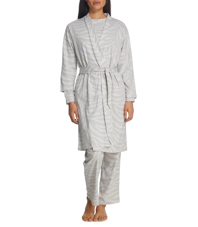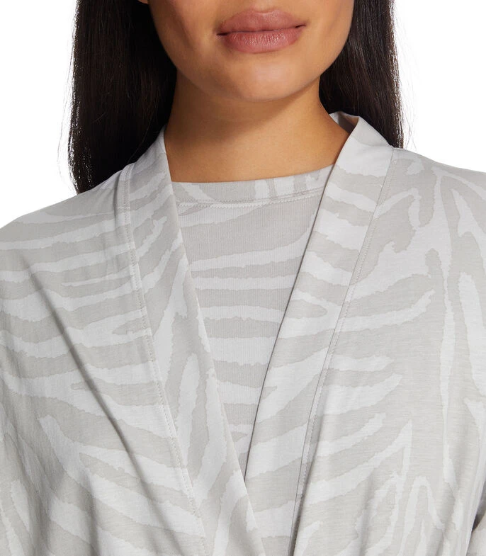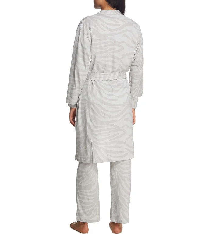 Bata para dormir UNWIND by Epsilon, en tejido de punto con diseño animalprint, cuello V abierto, manga larga y cinta para anudar.