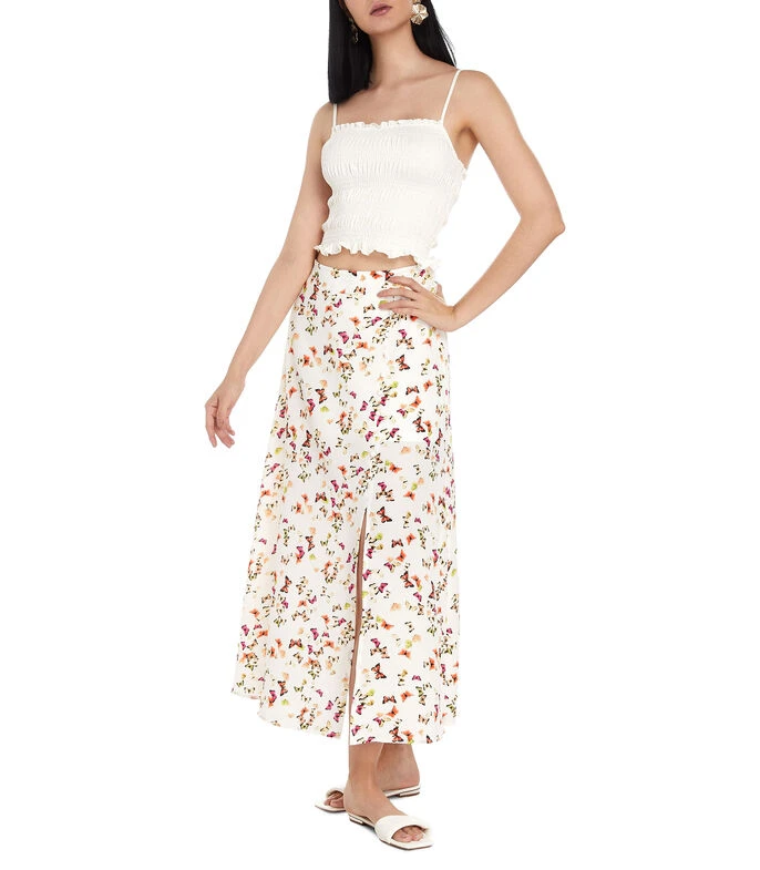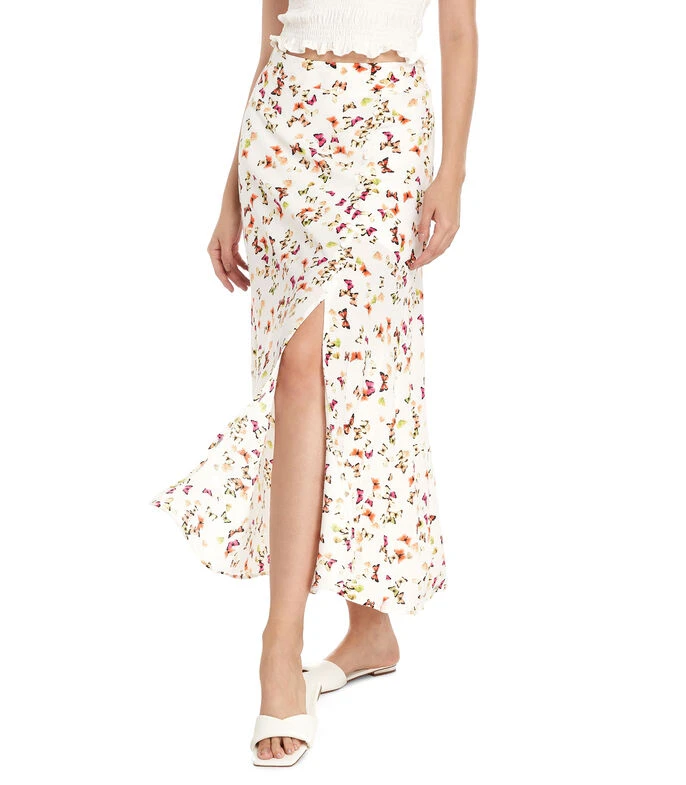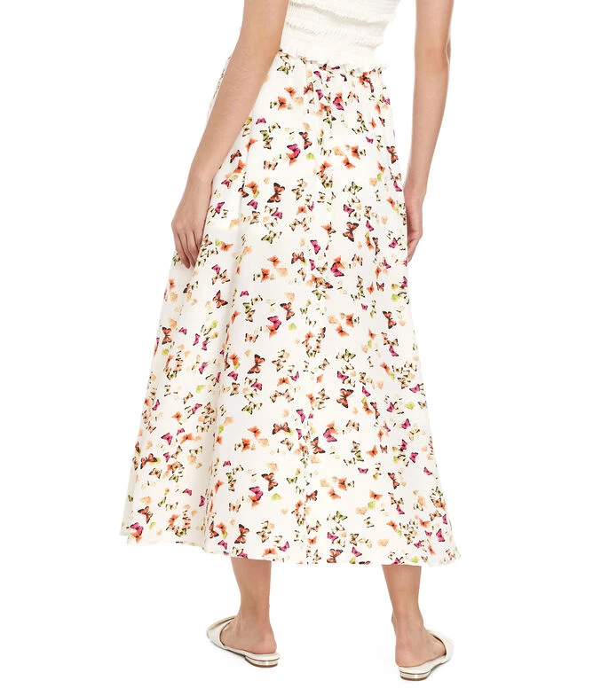 Falda larga BCBGeneration de corte «A» en tejido de punto con textura corrugada, diseño de mariposas, pretina elástica, botones decorativos y abertura en costado.