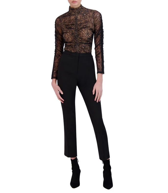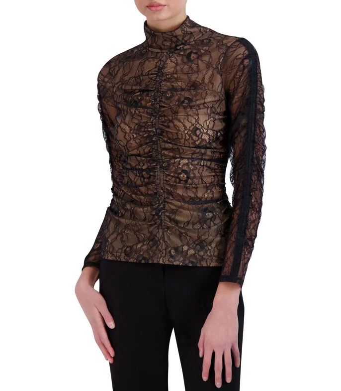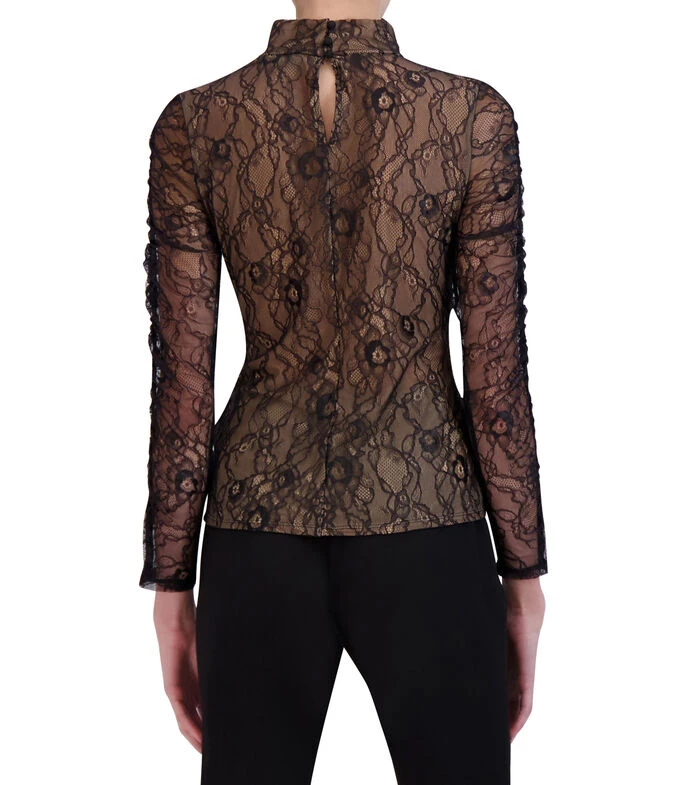 Blusa BCBGMAXAZRIA de corte recto en tejido de punto con encaje y botonadura en nuca.