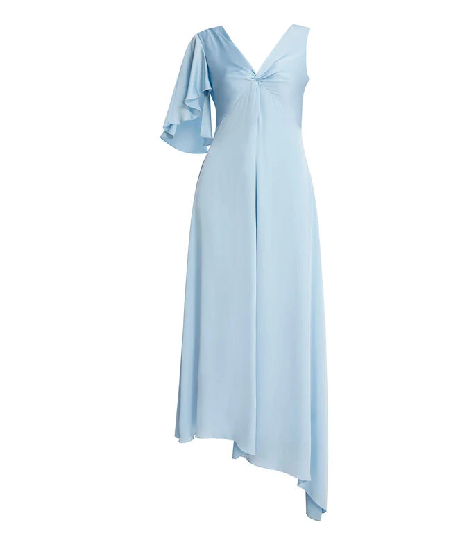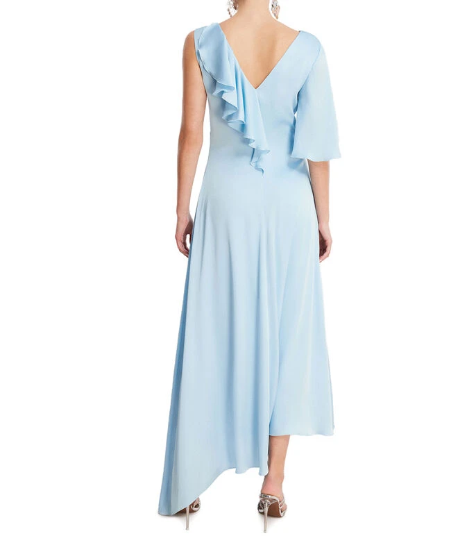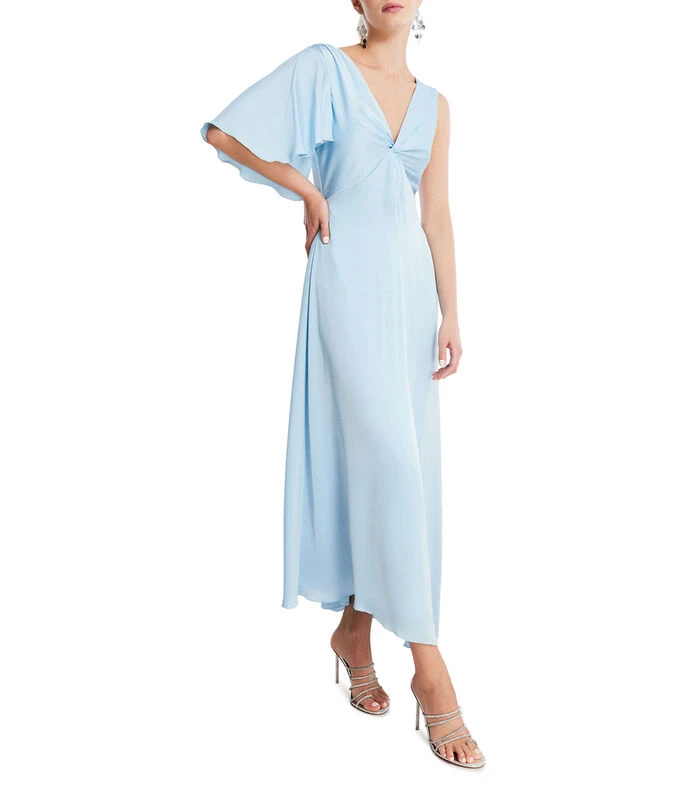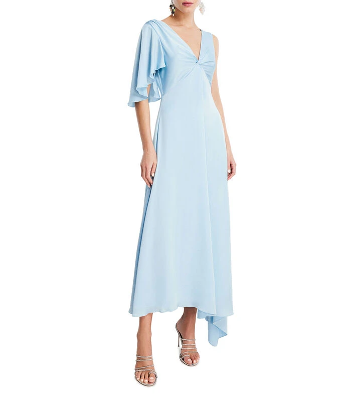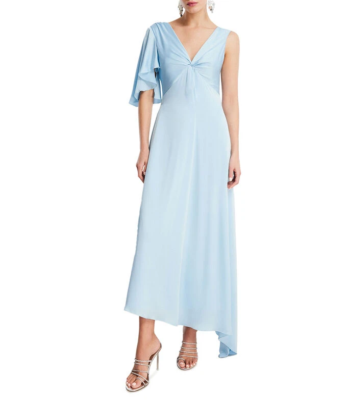 Maxi Vestido de fiesta BCBGMAXAZRIA de corte A en tejido de punto, cuello V, una manga 3/4 acampanada, nudo decorativo y holanes inferiores.