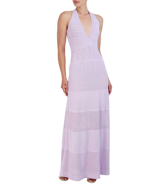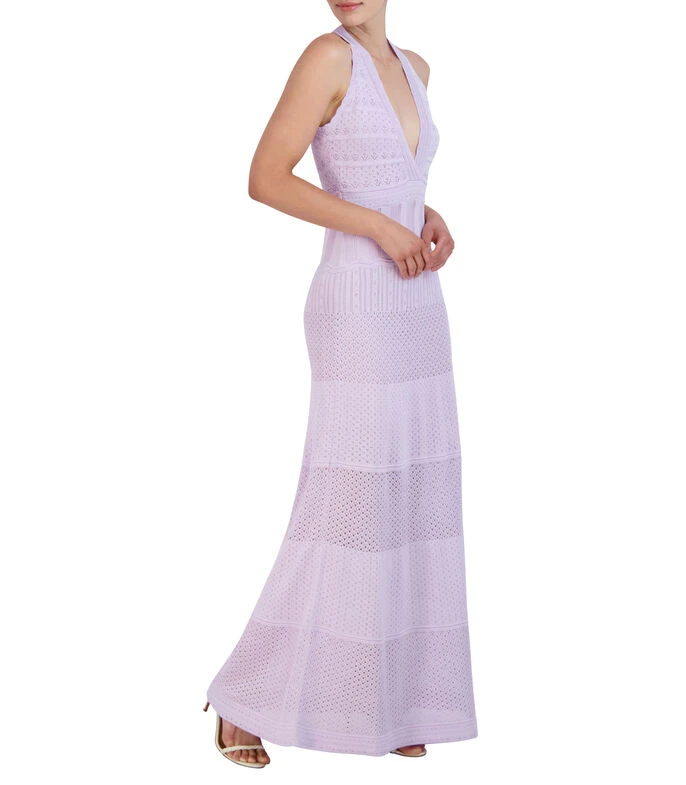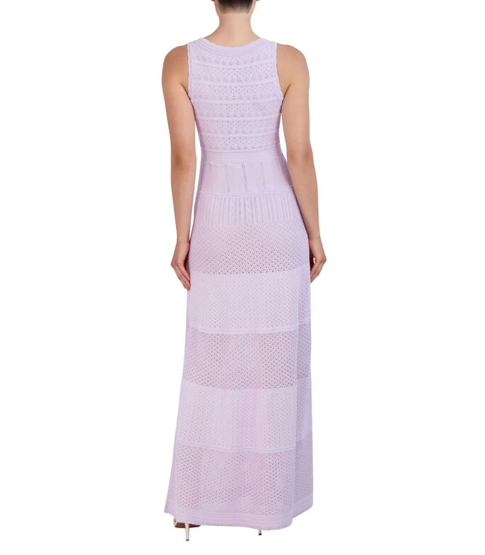 Maxi vestido BCBGMAXAZRIA de corte recto en tejido de punto tipo crochet con diseño geométrico, tirantes anchos y cuello «V»; Para deslumbrar en cualquier evento, no hay mejor opción que este hermoso vestido.