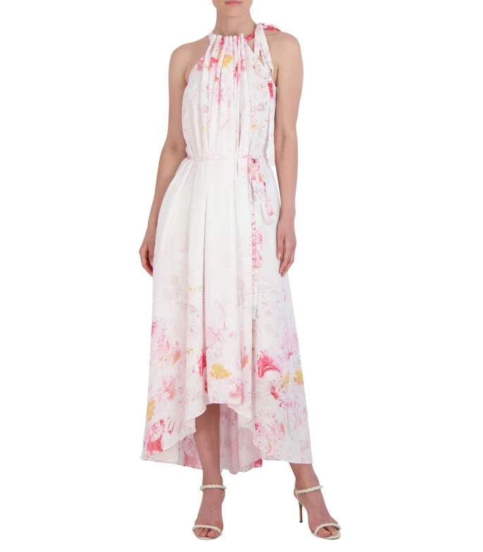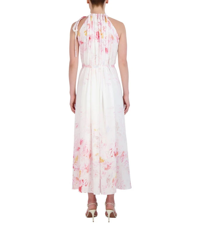 Vestido maxi BCBGMAXAZRIA de corte recto en tejido de punto con estampado floral, escote halter y bolsillos en costados.