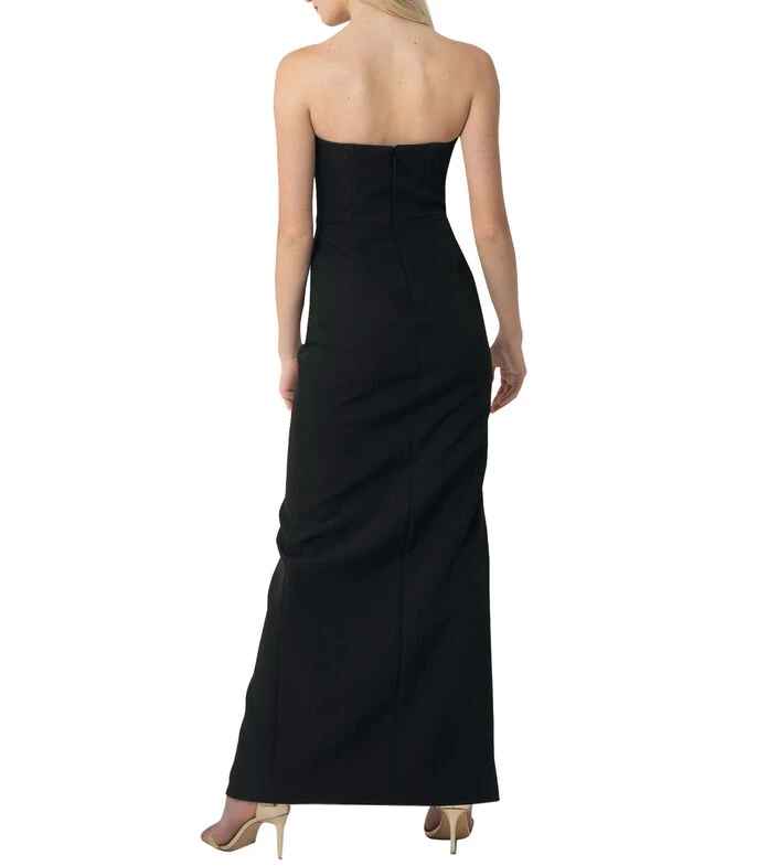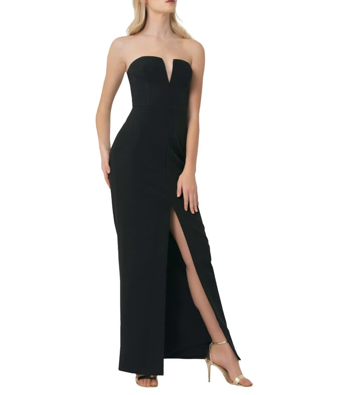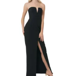 Vestido maxi BCBGMAXAZRIA de noche en corte ajustado con tejido de punto liso, hombros al descubierto, abertura en pecho y sobre faldón a nivel frontal.