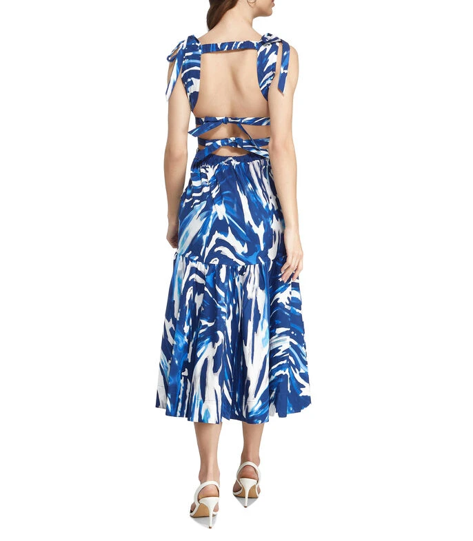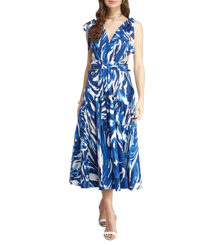 Vestido BCBGMAXAZRIA maxi de corte A en tejido de punto, cuello V, sin mangas, cintas de ajuste, estampado a contraste y espalda descubierta.