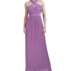 Vestido BCBGMAXAZRIA maxi de corte recto en tejido de punto, acabado plisado, cuello halter con detalle de abertura decorativa, cinta en cintura, detalle de olanes en parte inferior, abertura en costados y cremallera en espalda.