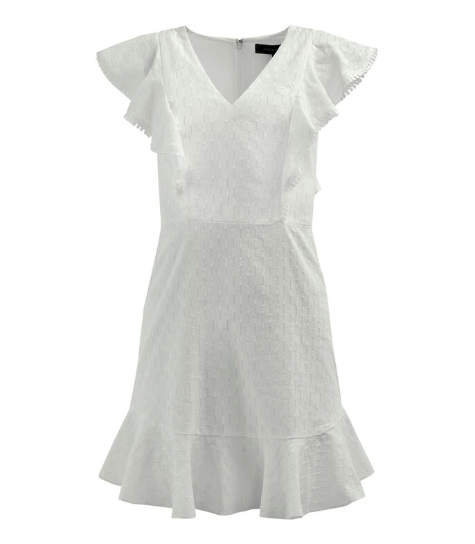 Vestido BCBGMAXAZRIA midi de corte evasé en tejido de punto, cuello V, sin mangas, olanes en bordes de mangas, microdiseños, olan en el borde inferior y cierre de cremallera en la parte trasera.