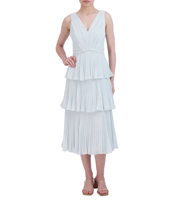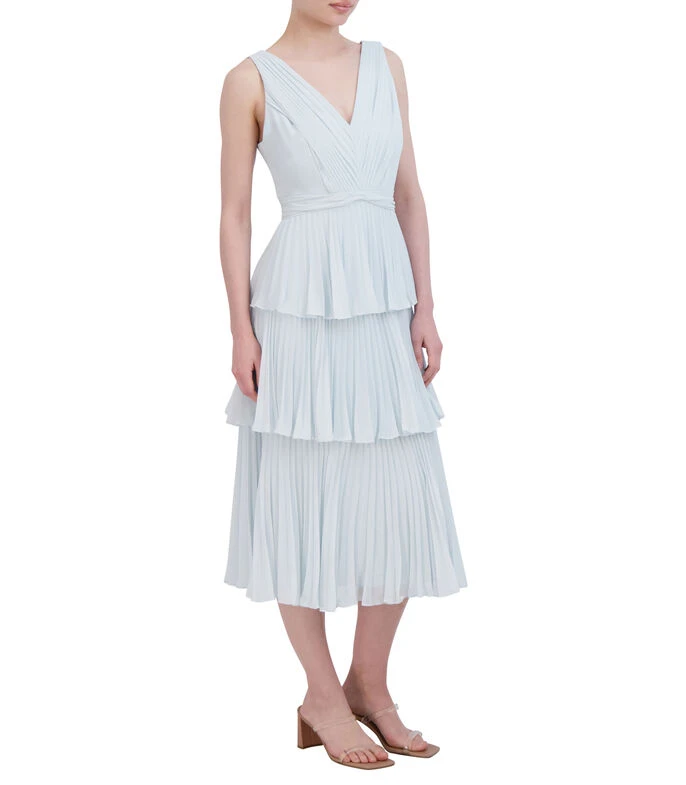 Vestido BCBGMAXAZRIA midi de corte A en tejido de punto, cuello V, sin mangas, diseño plisado y con olanes en tres tamaños en la falda; cierre en la parte trasera.