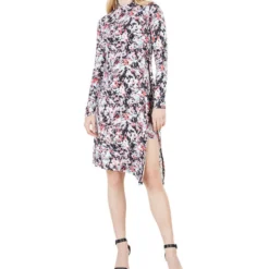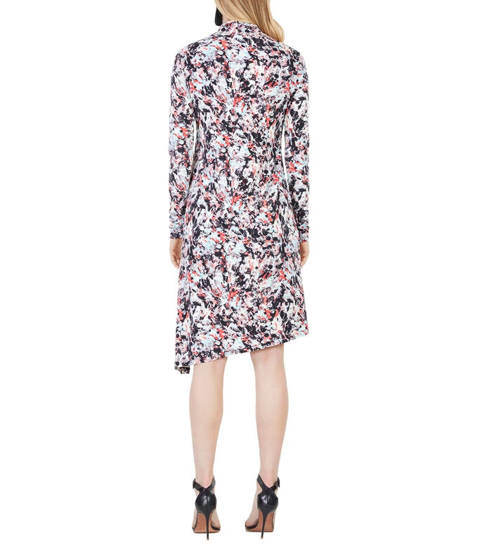 Vestido mini BCBGMAXAZRIA asimétrico de corte recto en tejido de punto con estampado multicolor y abertura sobre un costado.