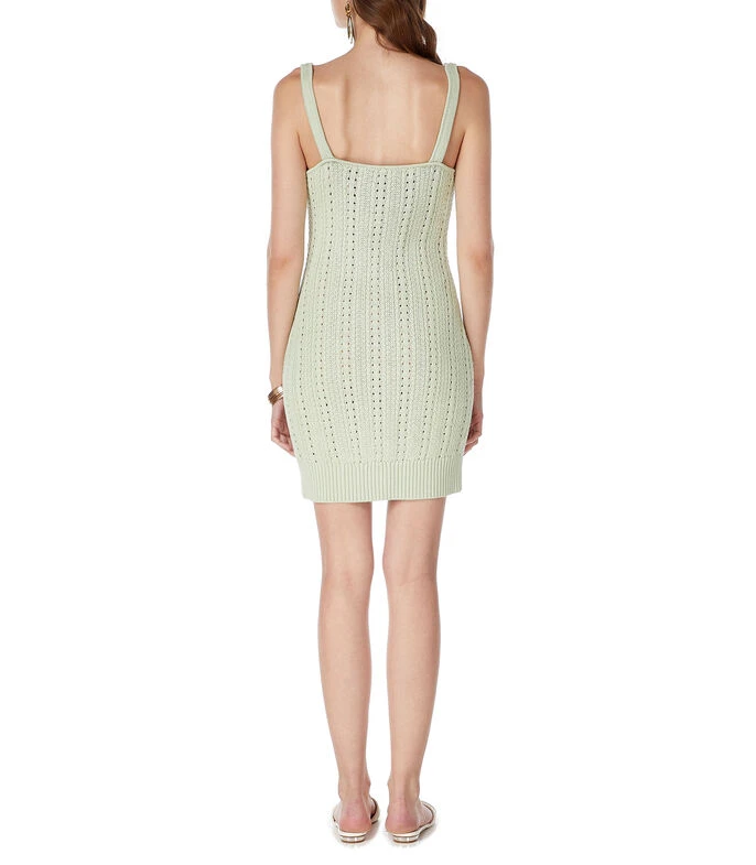 Vestido BCBGMAXAZRIA mini de corte recto en tejido de punto calado, cuello V, tirantes delgados y sin mangas.
