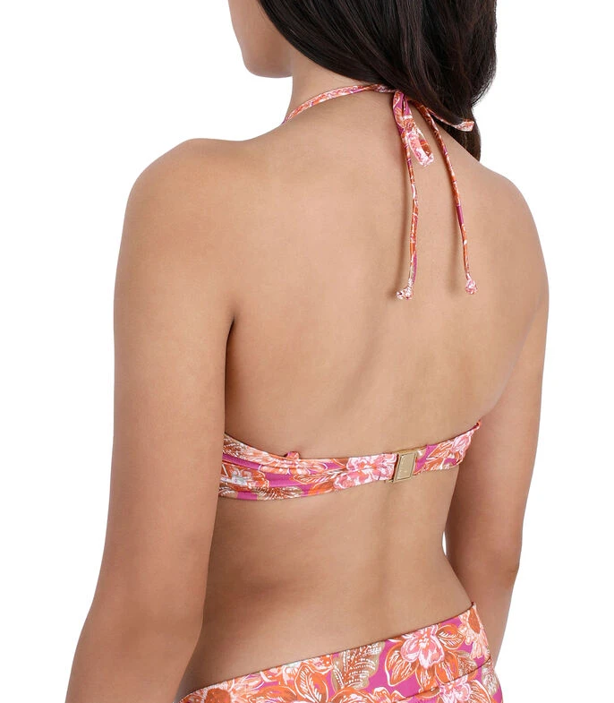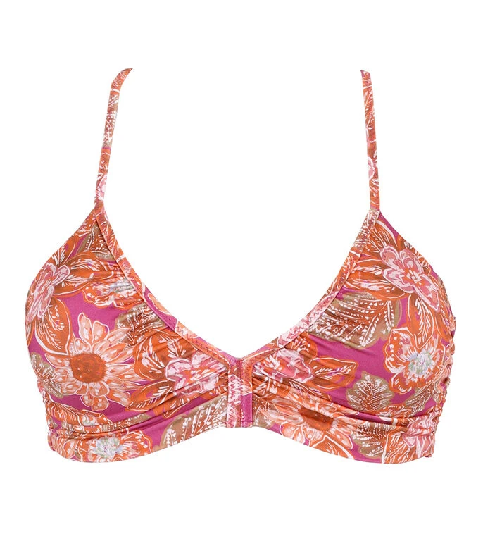 Bikini Top Zingara Alocasia, en tejido de punto, detalle de frunce al frente, tirantes delgados ajustables en la parte de la nuca, broche en la parte trasera y estampado floral.