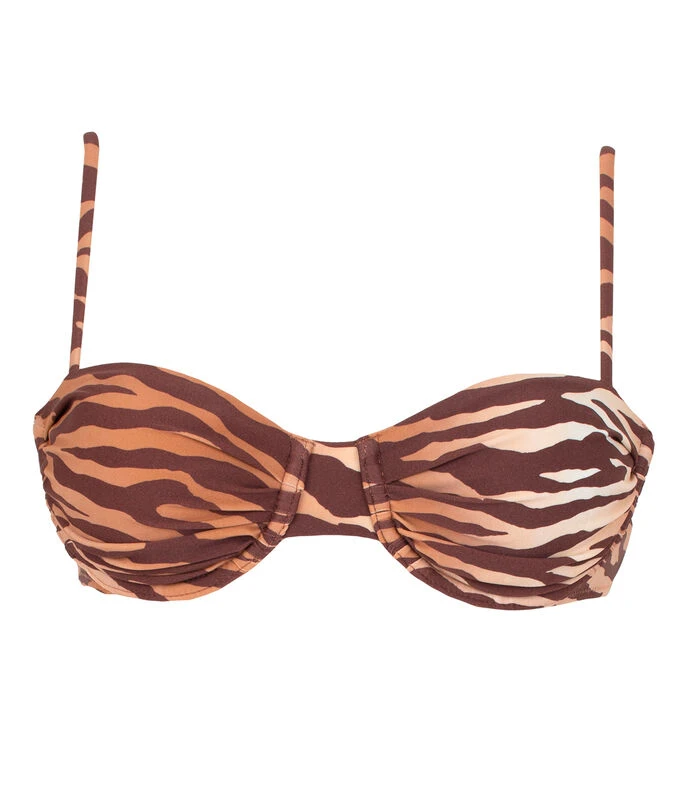 Bikini top Zingara en tejido de punto con textura, estampado animal print tigre, tirantes finos ajustables, detalle de pliegues y cintas de amarre en espalda.