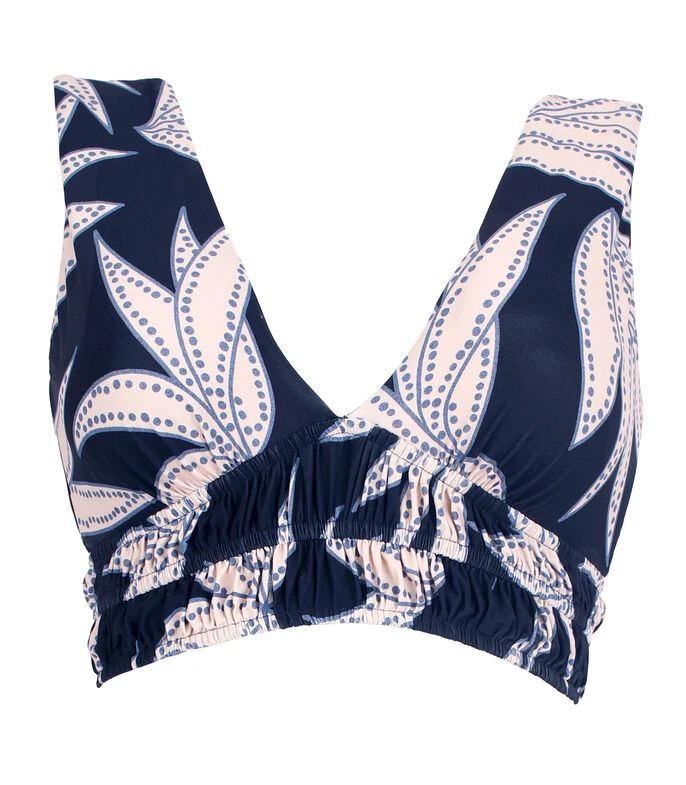 Bikini top Zingara Kentia en tejido de punto con hojas, copas suaves removibles, tirantes anchos, borde inferior elástico y lazo en espalda.