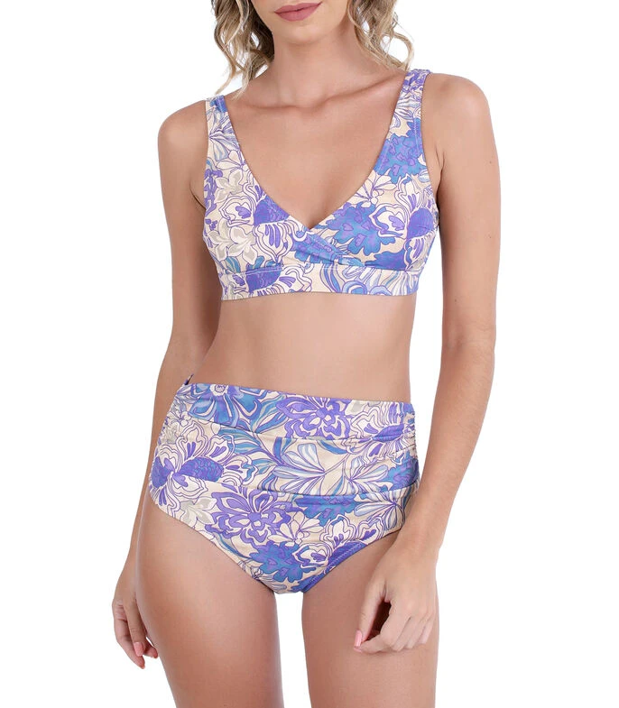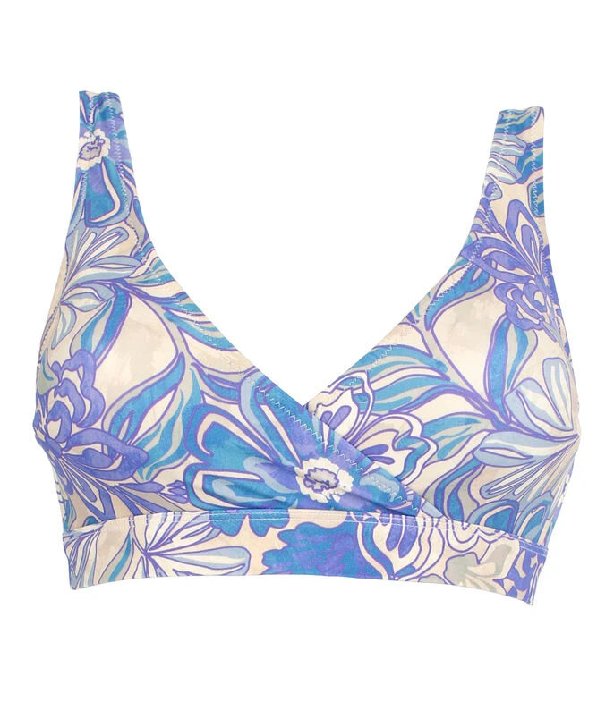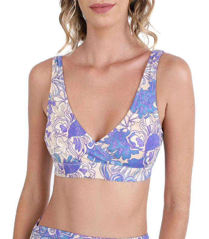 Bikini top Zingara Persea en tejido de punto con flores, estilo cruzado, copas suaves removibles, tirantes anchos y lazo en espalda; Ideal para una escapada a la playa este verano.