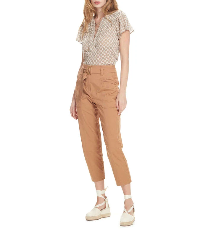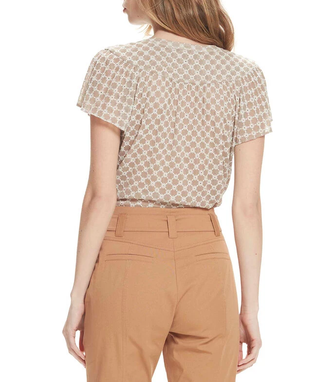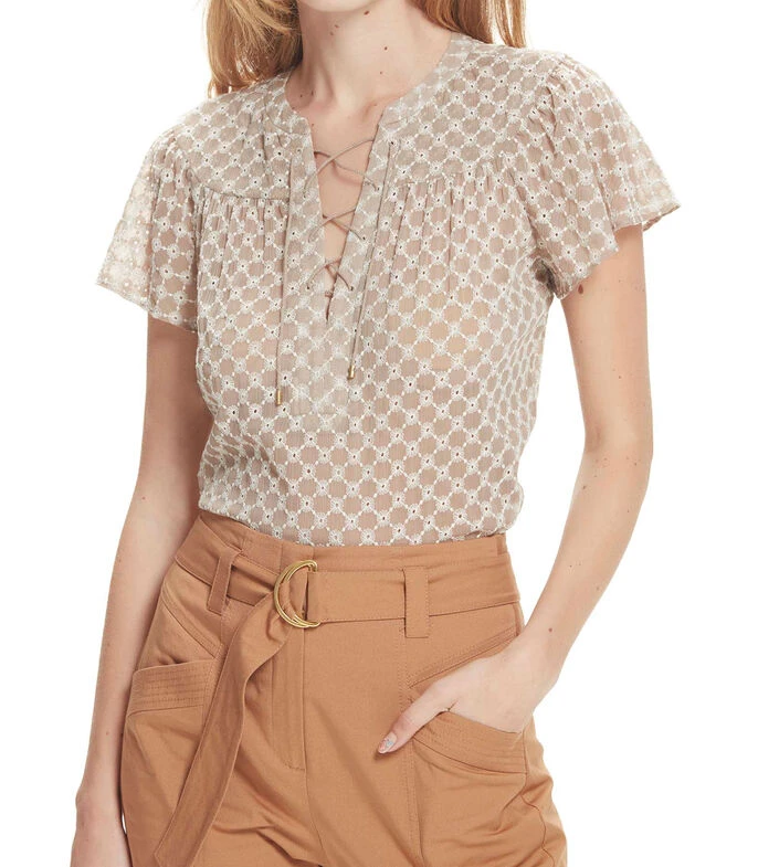 Blusa Julio de corte recto en tejido plano tipo chifón con bordados florales, escote en V y jareta en zigzag; manga corta de escarola.