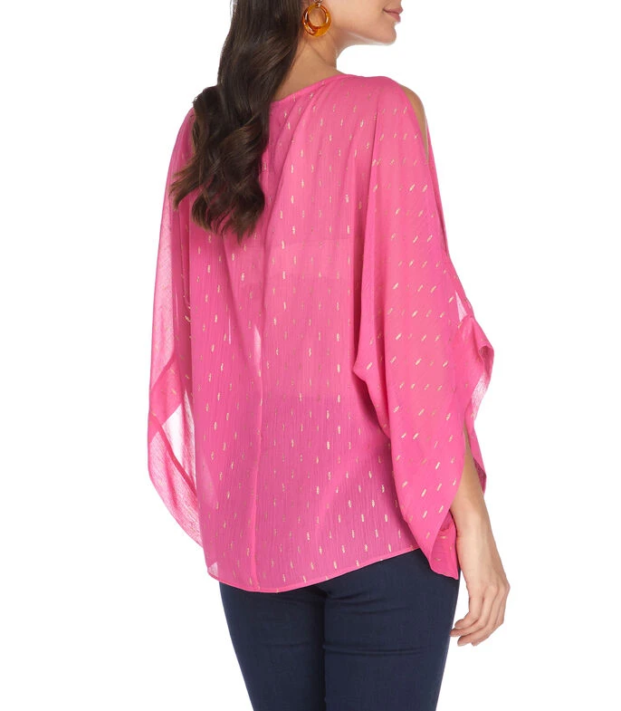 Blusa Pertegaz de corte oversized en tejido de punto semi transparente con hilos dorados, abertura sobre hombros y manga abombada.