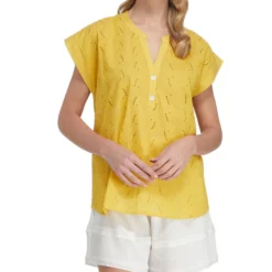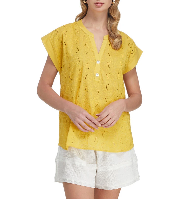 Blusa Cortefiel de corte recto en tejido de punto, cuello redondo con abertura en V con dos botones, sin mangas y diseños calados.