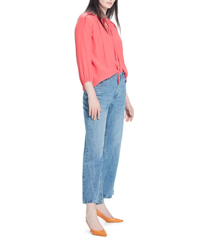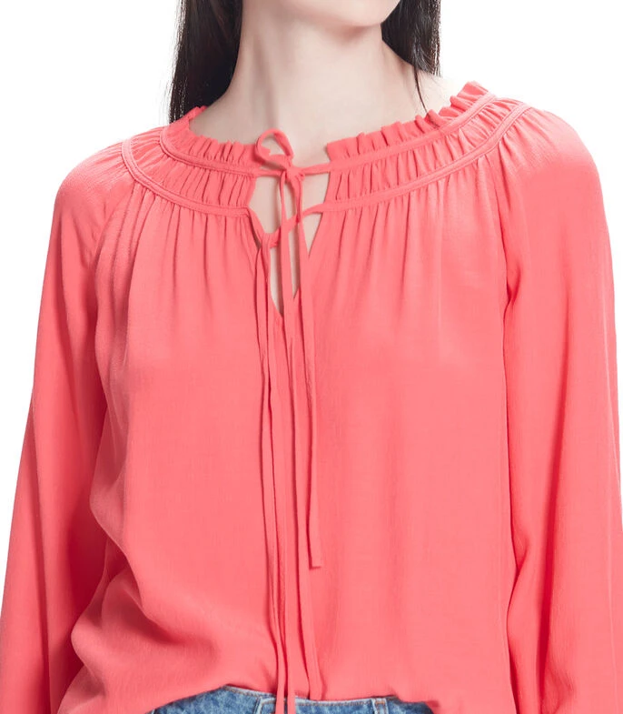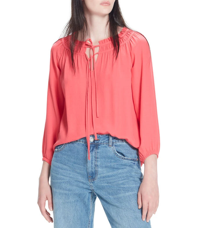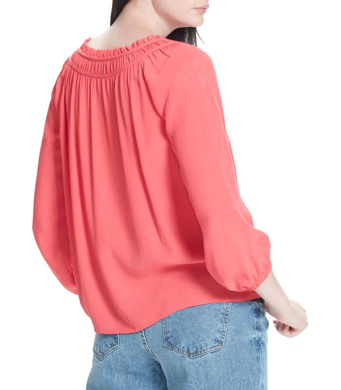 Blusa Julio de corte regular en tejido de punto, cuello redondo con escarolas y doble jareta fija en abertura al frente, manga 7/8 con elástico en bordes y crepe marocain.