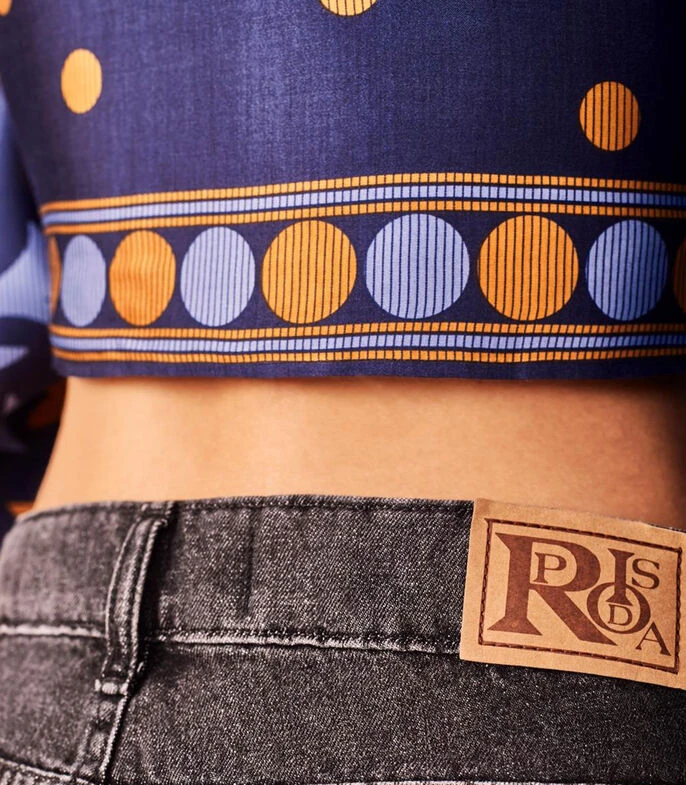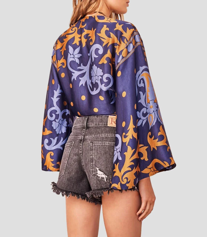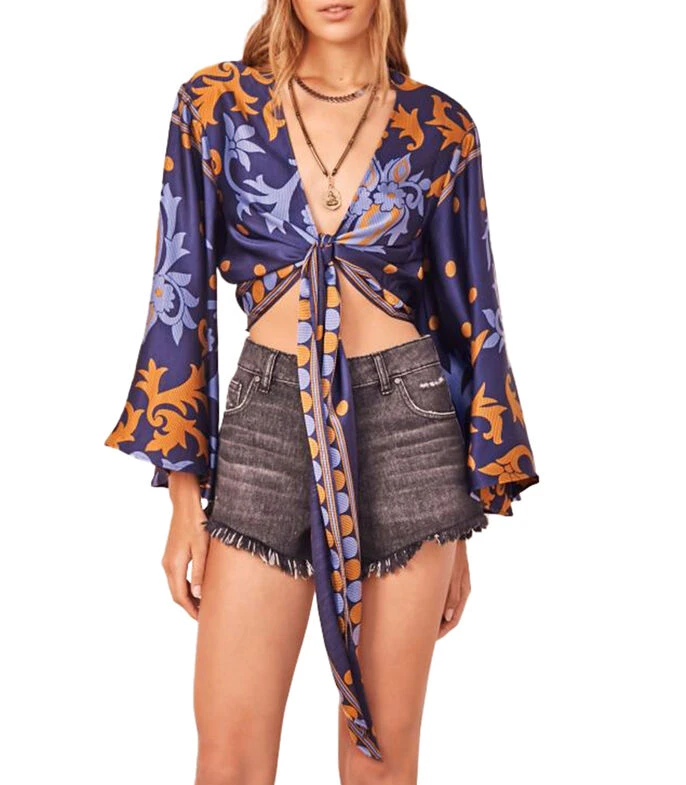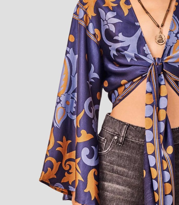 Blusa Rapsodia tipo Crop Top de corte Slim en tejido de punto satinado, cuello «V», manga larga acampanada, cintas para anudar al centro y estampado gráfico a contraste. Una prenda de espíritu libre con inspiración de los 70’s, perfecta para combinar con shorts.
