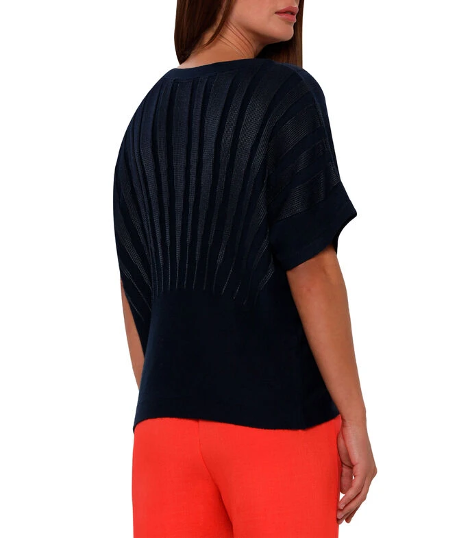 Blusa Escorpión de corte recto en tejido de punto con franjas en parte superior de la prenda con destellos plateados. Déjate sorprender por su comodidad y estilo vanguardista para toda ocasión.