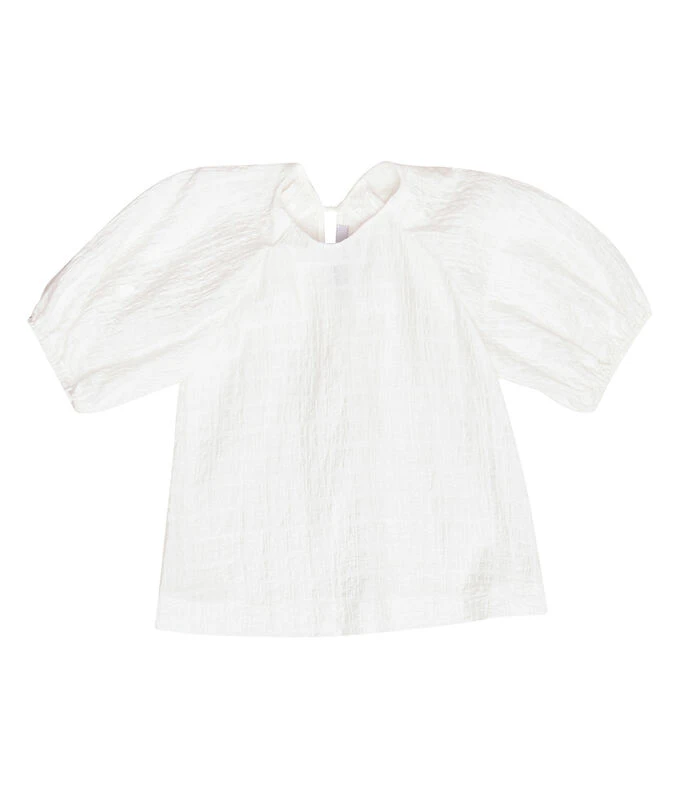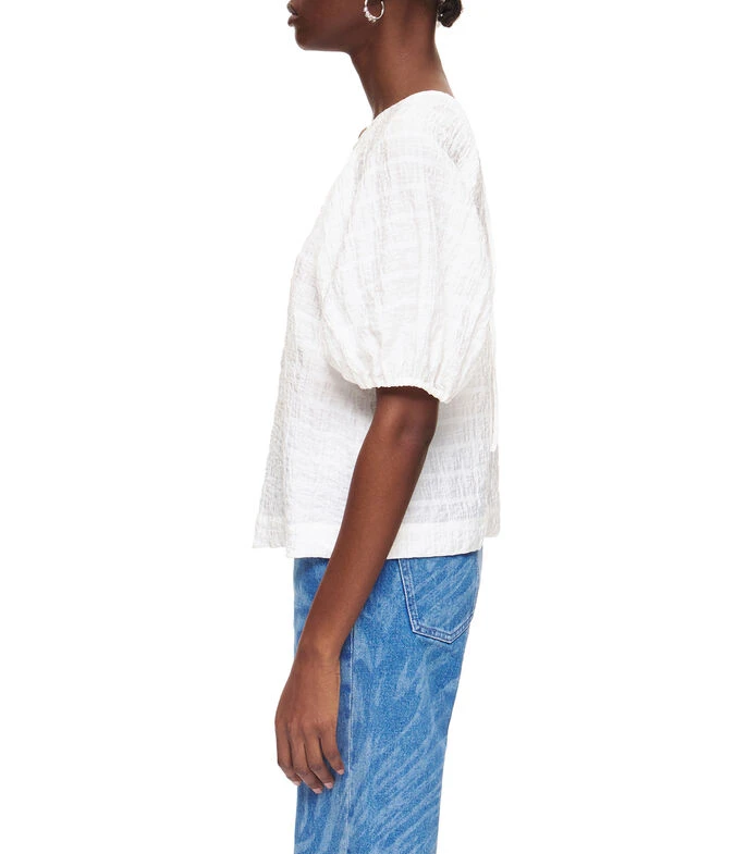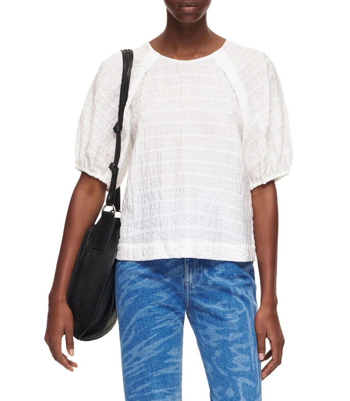 Blusa Bimba y Lola de corte regular en tejido de punto, cuello redondo, manga corta elástica abullonada, líneas a tono, escote en la espalda V con dos tiras delgadas ajustables.