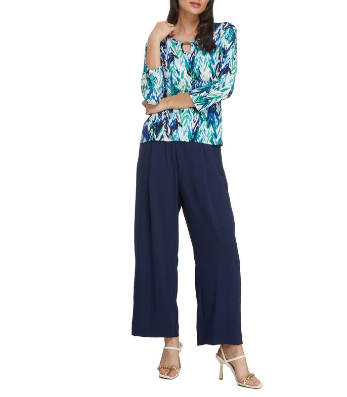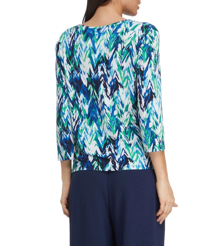 Blusa Charme de corte regular en tejido de punto con estampado a contraste, relieve a tono, detalle metálico en cuello redondo, manga 3/4 y abertura en escote.