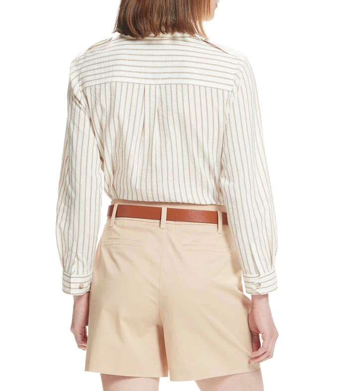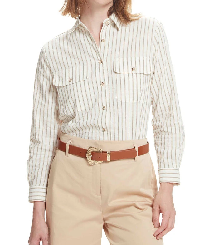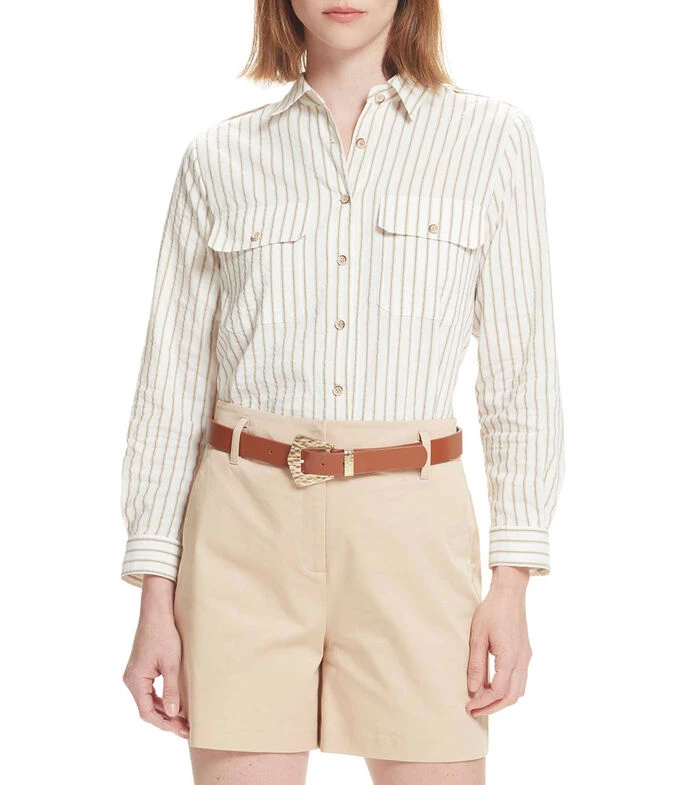 Blusa Julio de corte regular en tejido de punto, estampado de rayas, botonadura al frente y doble bolsillo de parche.