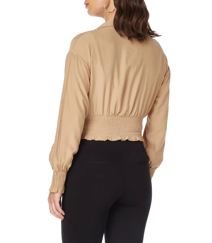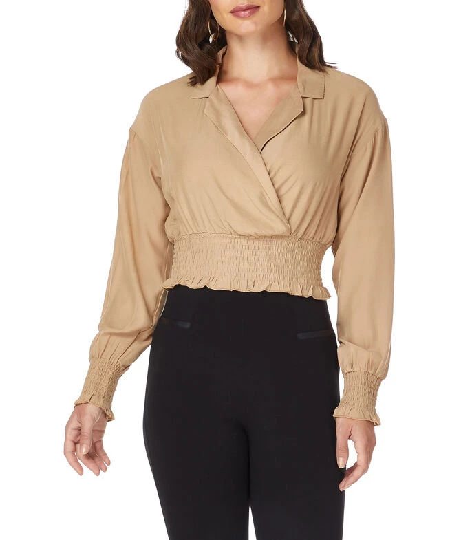 Blusa Epsilon de corte crop en tejido de punto, cuello V con solapa, manga larga con puños elásticos y detalle de frunce en borde bajo.
