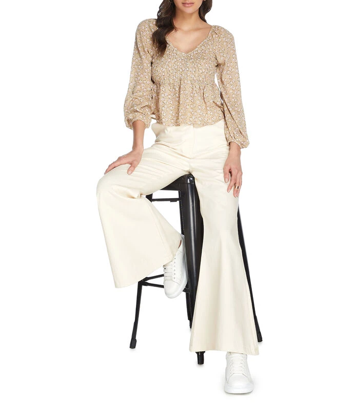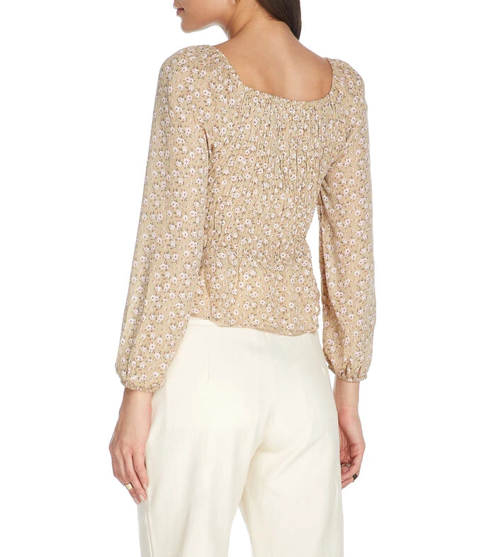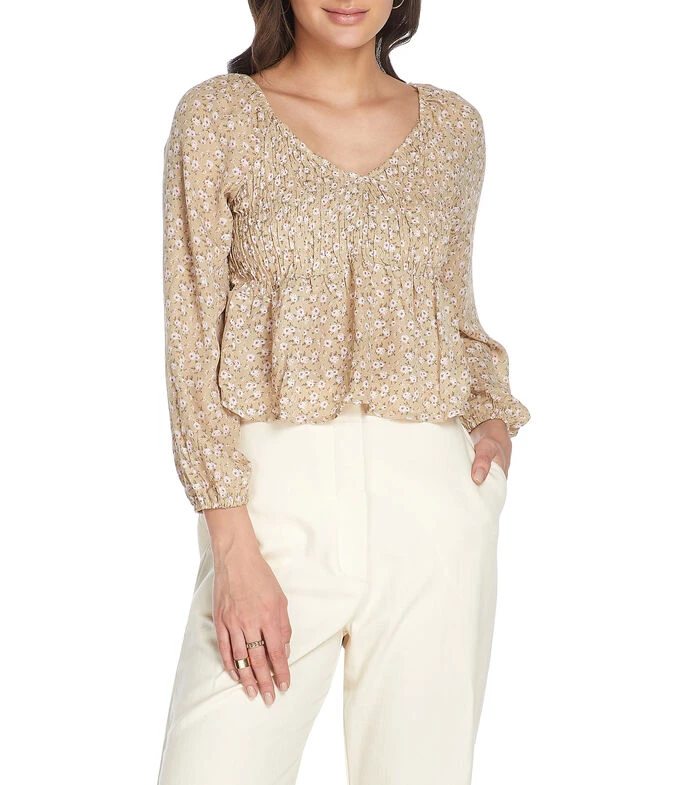 Blusa Catamaran tipo Crop Top de corte Slim en tejido de punto, cuello V, manga larga con puños elásticos, estampado de flores multicolor, pecho y espalda con detalle fruncido.