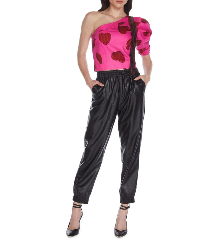Blusa cropped Jazmin Chebar de corte ajustado en tejido de punto con estampado de corazones, escote diagonal y diseño de una sola manga.