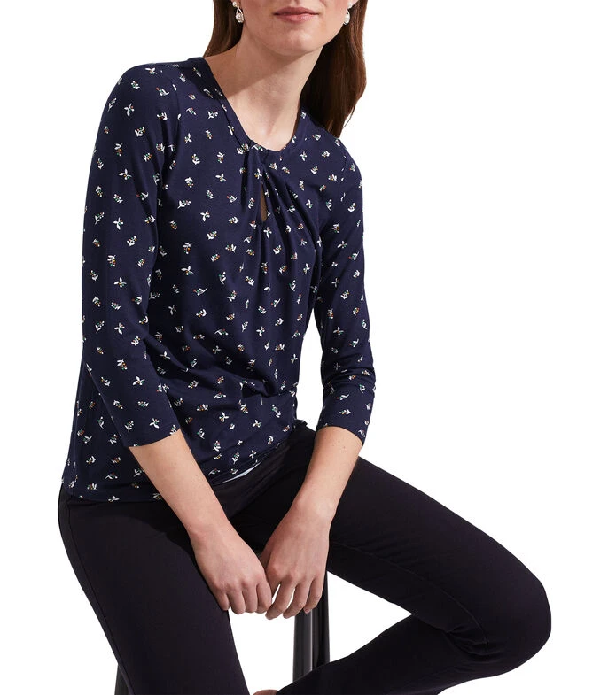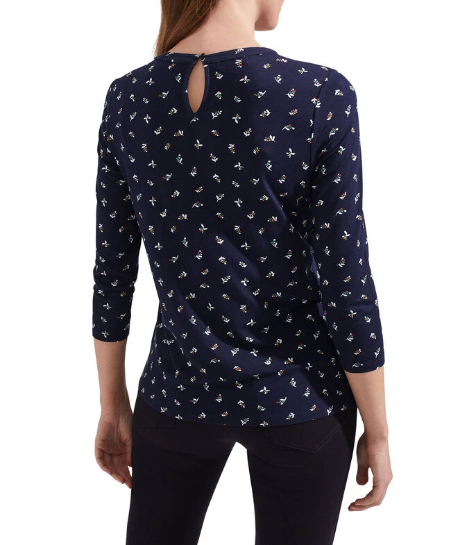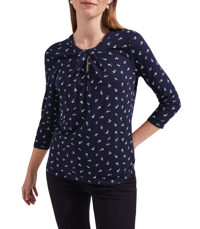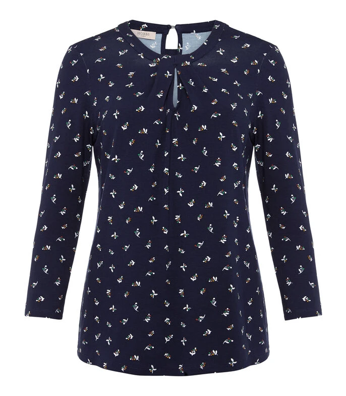 Blusa Hobbs Julia de corte regular en tejido de punto con estampado de pequeñas flores, pliegues en cuello, abertura en escote y cierre posterior de botón.