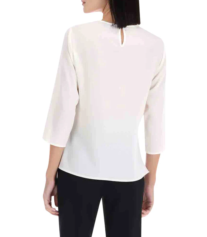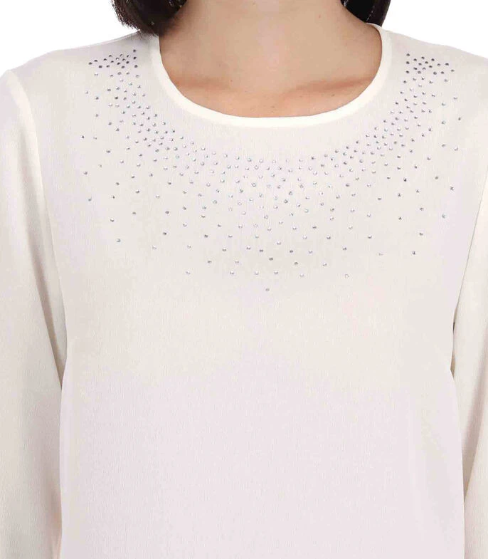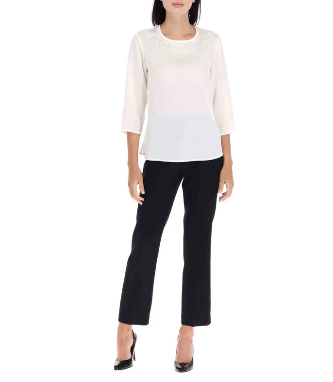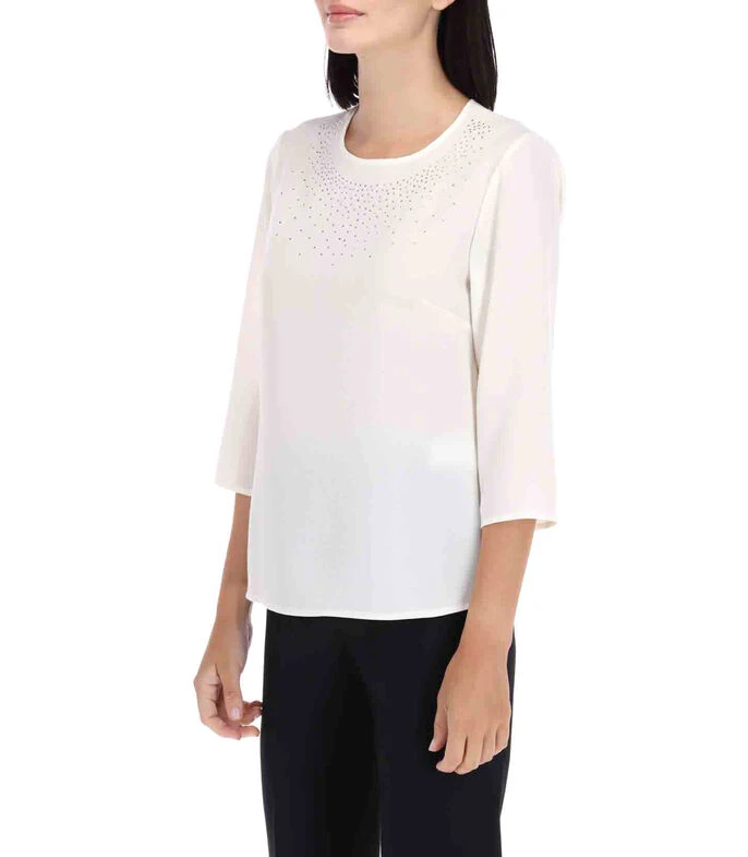 Blusa Charme de corte regular en tejido de punto con aplicación de pedrería en parte frontal, manga 3/4 y botón en parte trasera del cuello.
