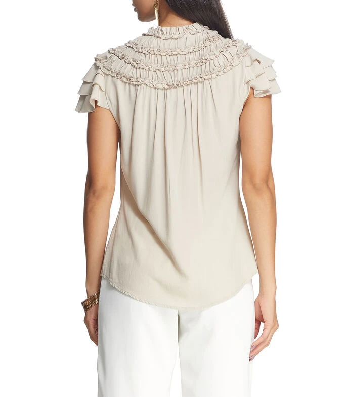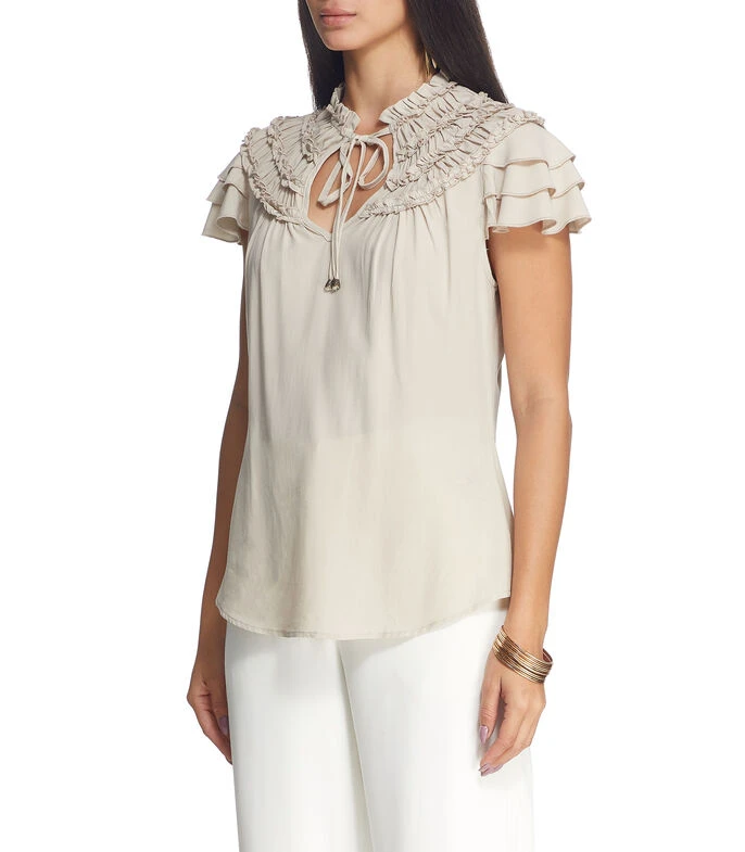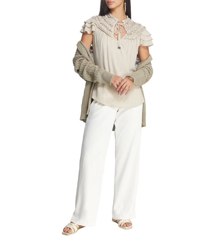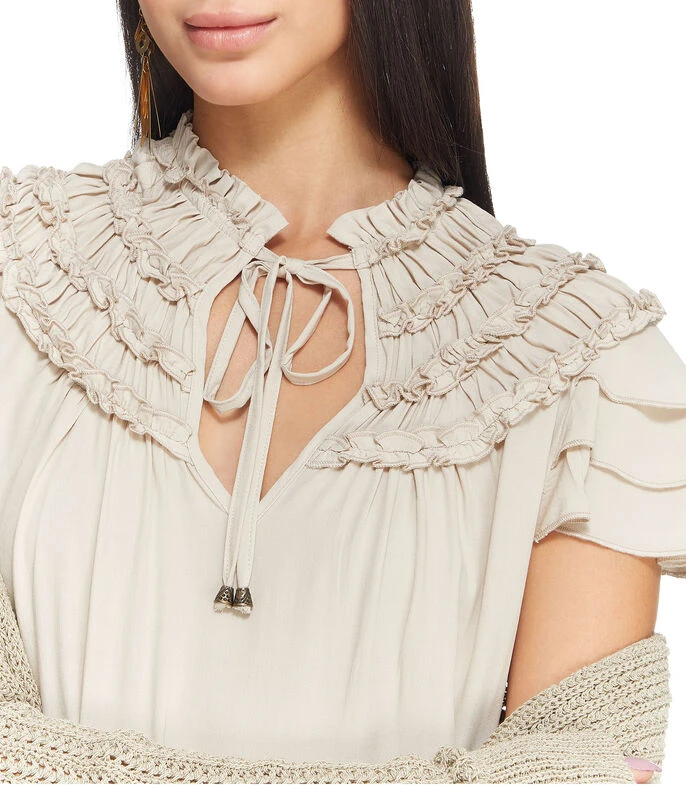 Blusa Chester & Peck de corte regular en tejido de punto con aplicación de olanes, bloques fruncidos, pliegues en espalda, cintas de amarre en cuello y abertura en escote.