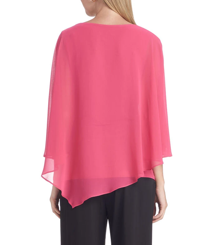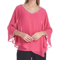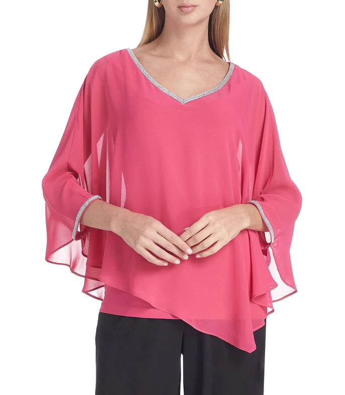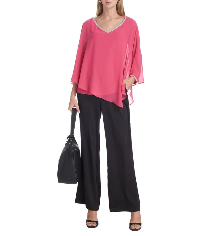 Blusa Frank Lyman de corte relaxed en tejido de punto con diseño tipo capa, aplicación de pedrería fantasía tanto en cuello como en manga y forro interior.