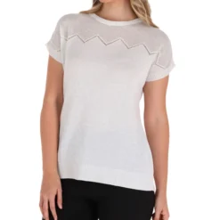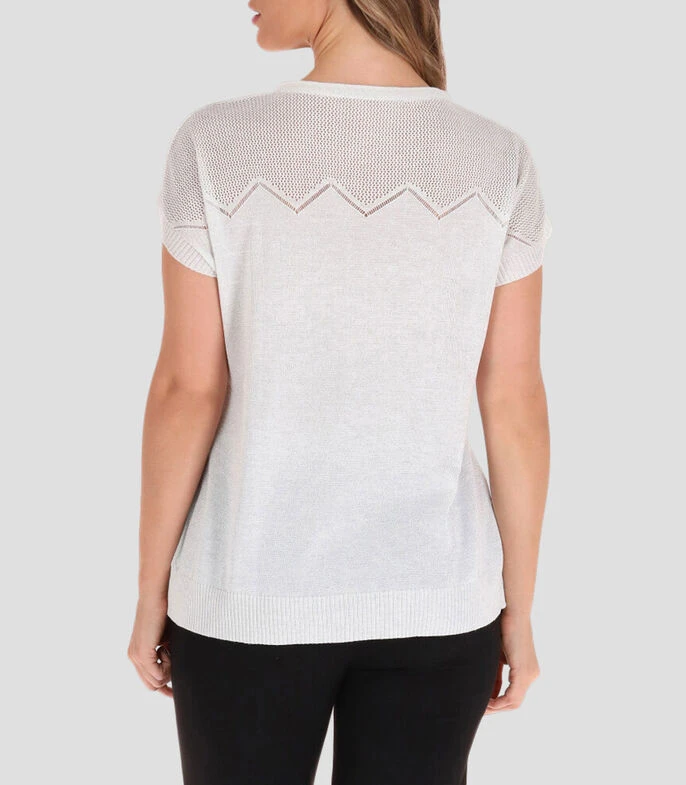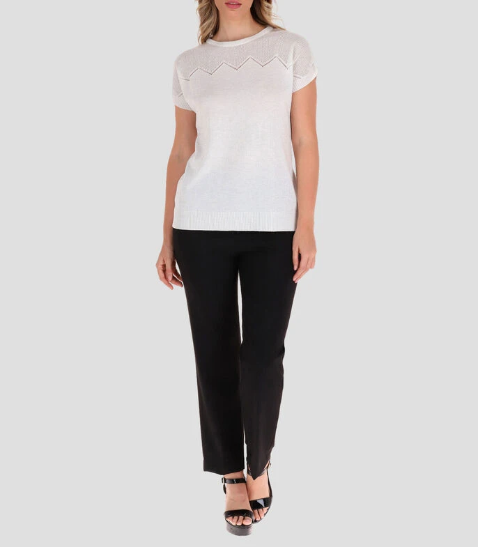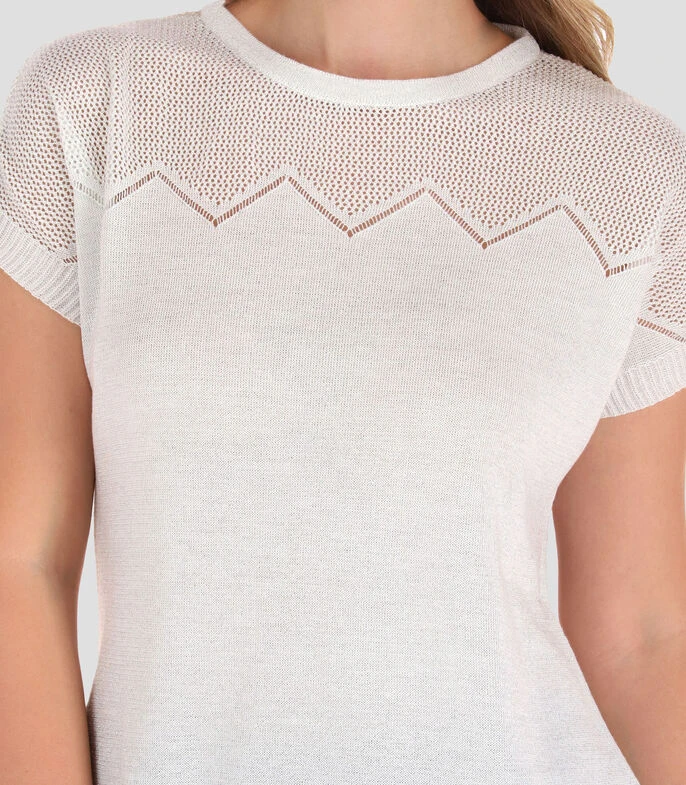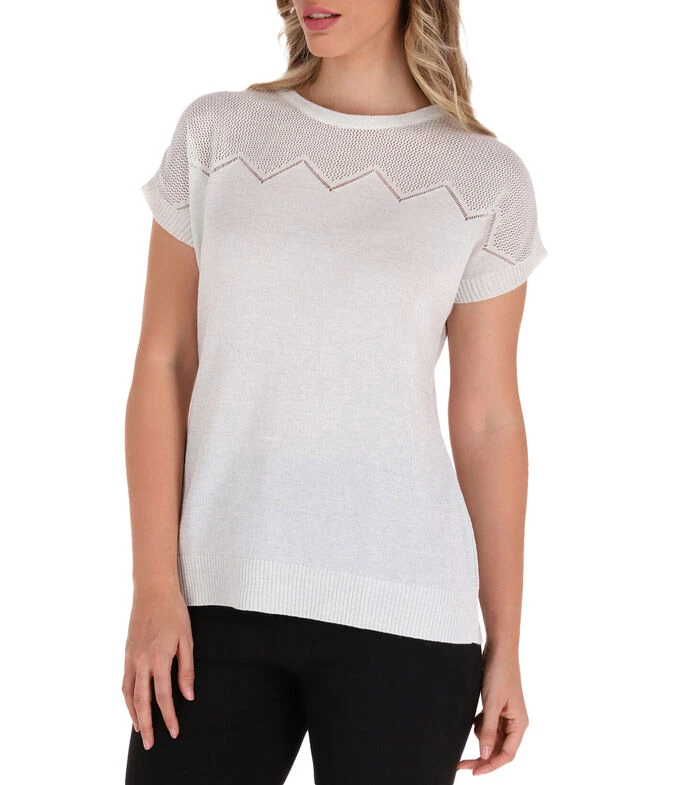 Blusa Charme de corte recto en tejido de punto con diseño liso, acabado calado en el pecho, cuello redondo y manga corta.