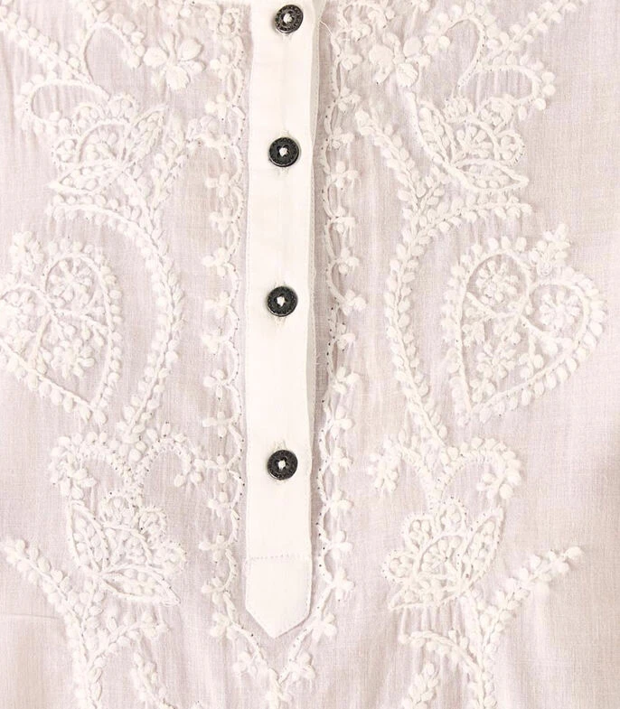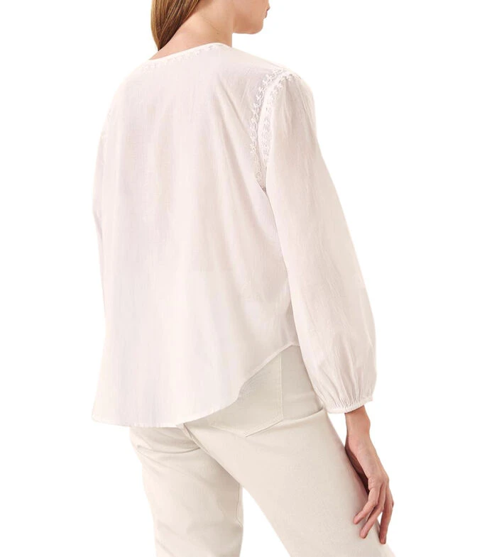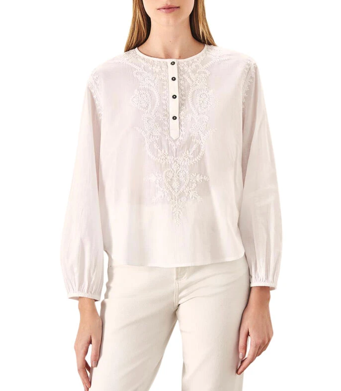 Blusa Rapsodia de corte regular en tejido de punto con diseño bordado a contraste, cuello redondo, media botonadura a contraste y manga larga.
