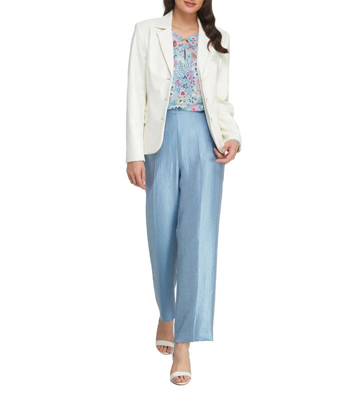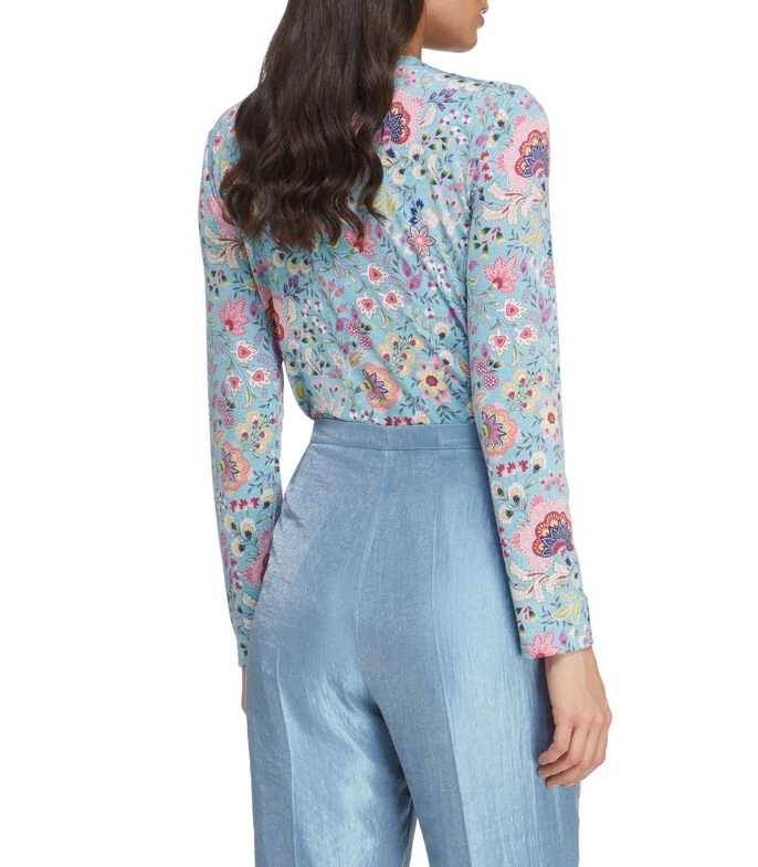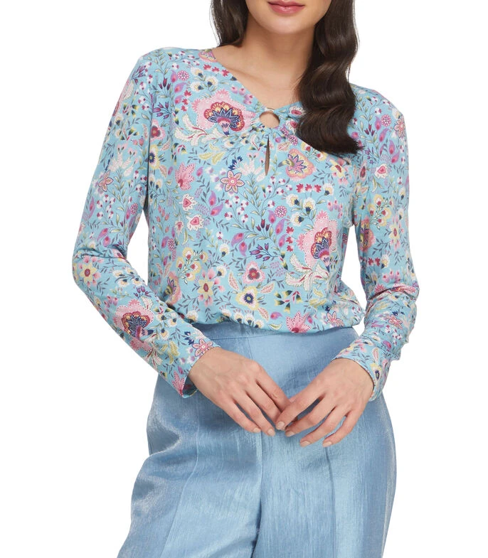 Blusa Charme de corte regular en tejido de punto con diseño cachemira en mosaico a contraste, cuello V con adorno metalizado y manga larga.
