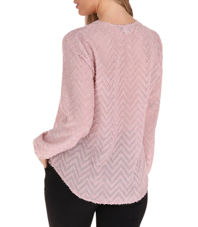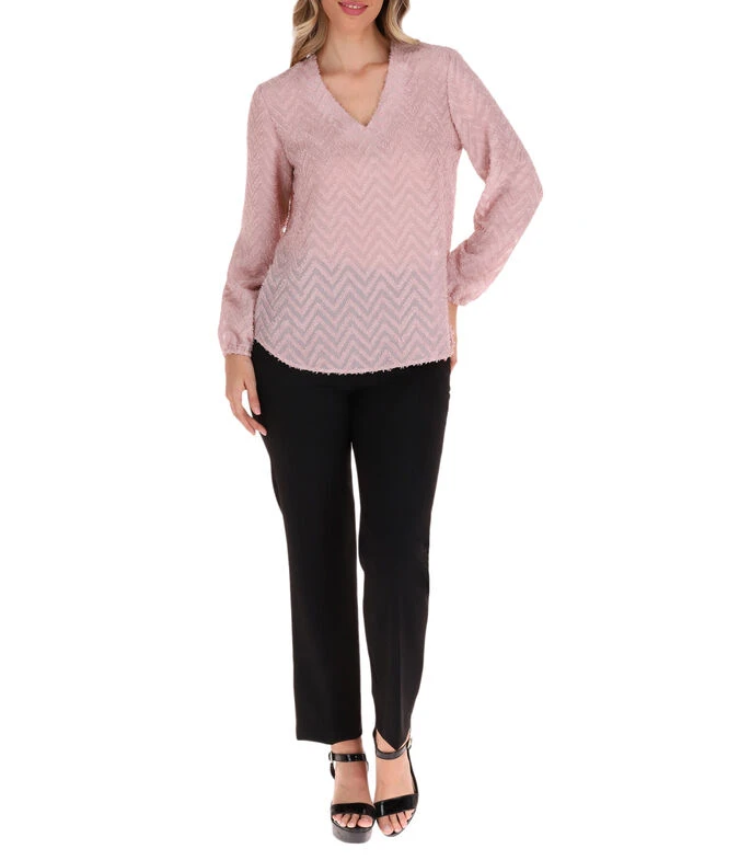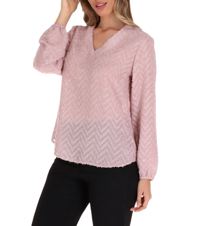 Blusa Charme de corte recto en tejido de punto con diseño liso, acabado con flequillos en zigzag, cuello V y manga larga.