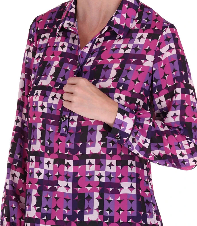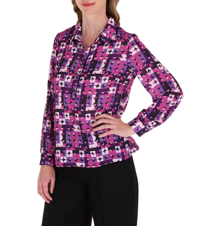 Blusa Charme de corte regular en tejido de punto, estampado alusivo al modelo, cuello camisero, media botonadura a contraste y manga larga.