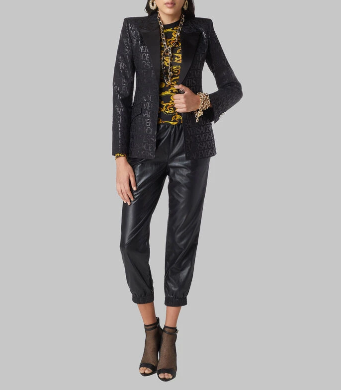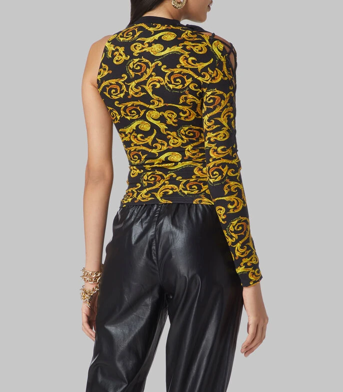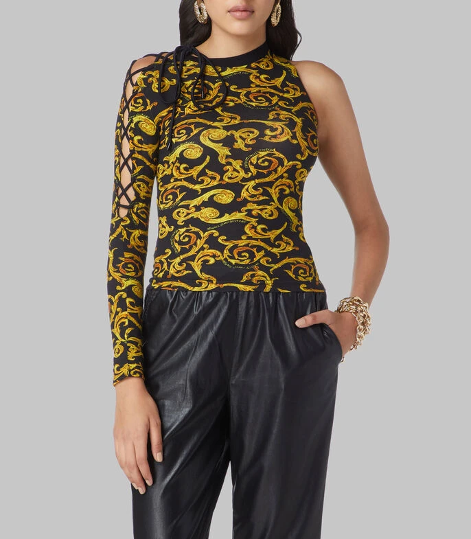 Blusa Versace Jeans Couture de corte recto en tejido de punto con estampado de la marca, cuello redondo en acabado canalé, diseño de una sola manga larga e inserción de cordones ajustables en el hombro izquierdo.