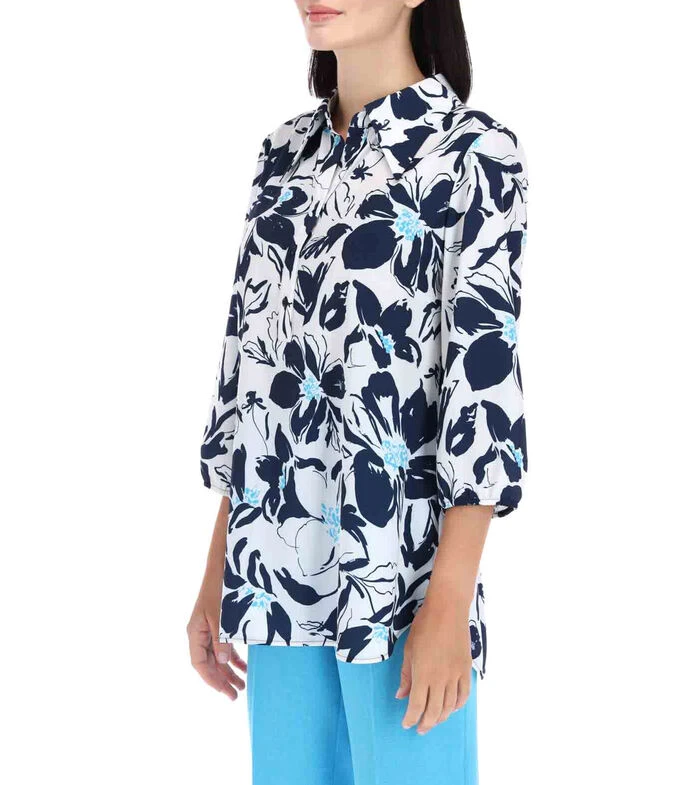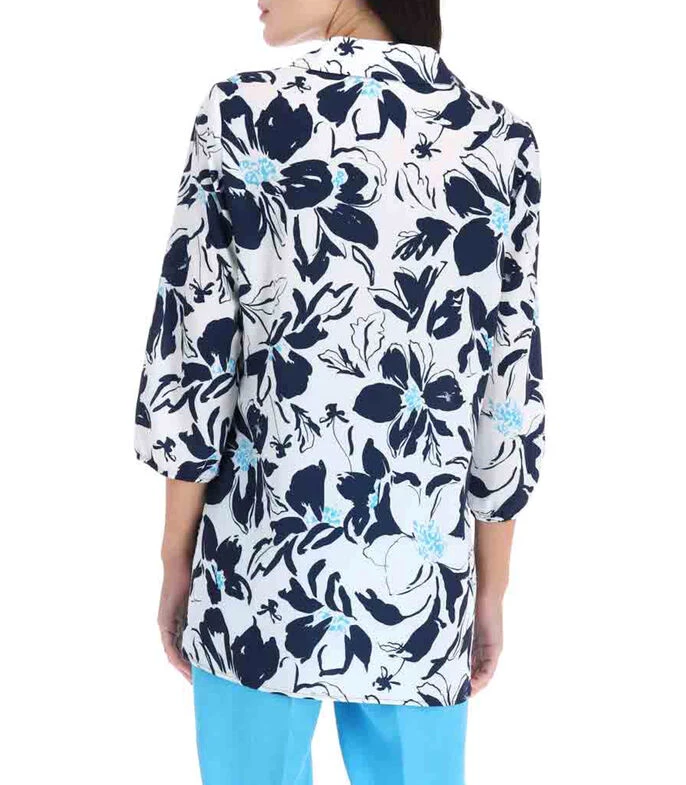 Blusa Charme de corte recto en tejido de punto, una prenda con cuello V, media botonadura a contraste, manga 3/4 ideal para sentirte fresca y un estampado floral a tono con la temporada.
